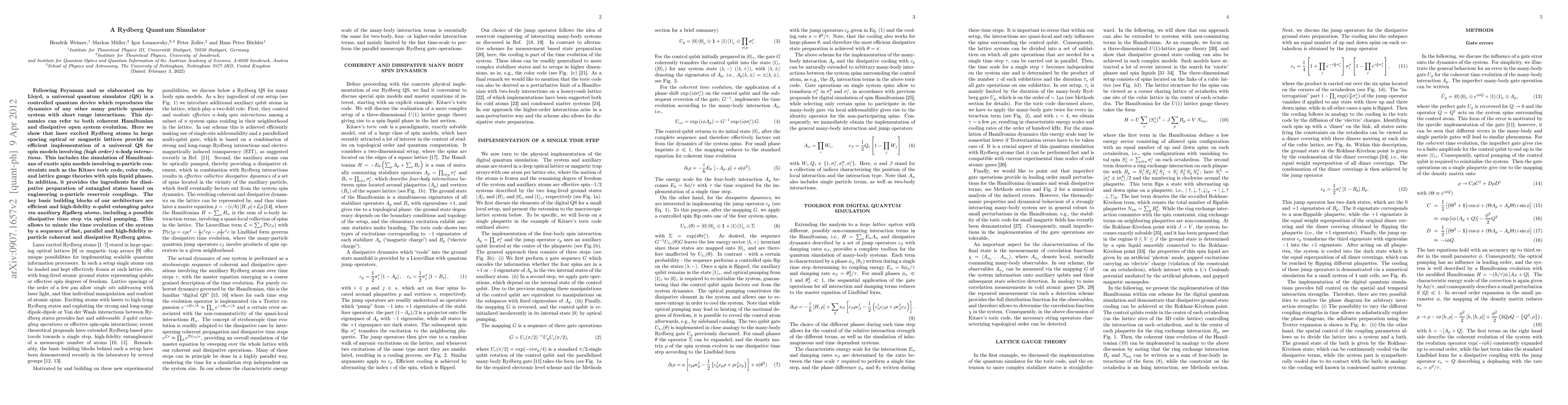 This paper explores the use of laser-excited Rydberg atoms in optical or magnetic lattices to create a universal quantum simulator capable of reproducing the dynamics of various many-particle quantum systems, including exotic spin models and lattice gauge theories. The proposed architecture leverages high-fidelity n-qubit entangling gates and dissipative processes to simulate both coherent Hamiltonian and open system evolution.
