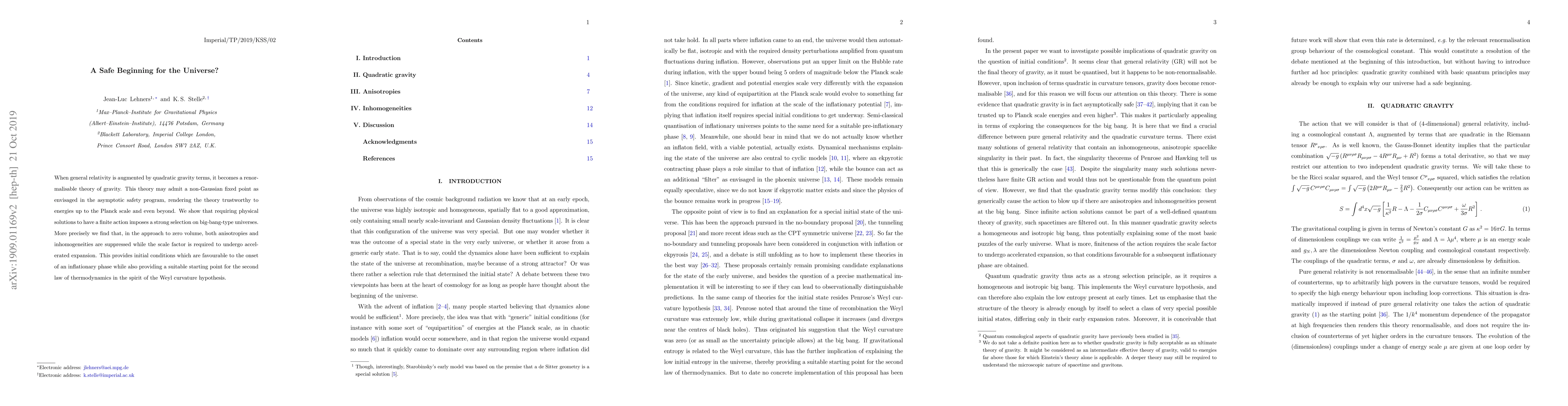 When general relativity is augmented by quadratic gravity terms, it becomes a renormalisable theory of gravity. This theory may admit a non-Gaussian fixed point as envisaged in the asymptotic safety program, rendering the theory trustworthy to energies up to the Planck scale and even beyond. We show that requiring physical solutions to have a finite action imposes a strong selection on big-bang-type universes. More precisely we find that, in the approach to zero volume, both anisotropies and inhomogeneities are suppressed while the scale factor is required to undergo accelerated expansion. This provides initial conditions which are favourable to the onset of an inflationary phase while also providing a suitable starting point for the second law of thermodynamics in the spirit of the Weyl curvature hypothesis.