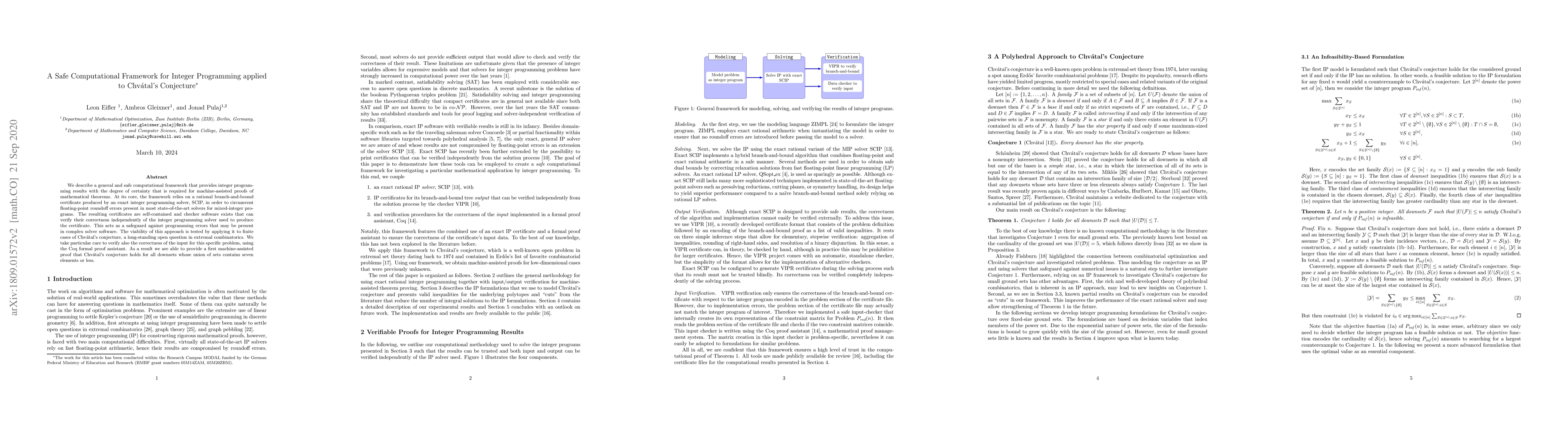 This paper presents a secure computational framework for integer programming that leverages exact solvers to produce verifiable certificates, ensuring machine-assisted proofs of mathematical theorems. The framework is applied to Chv\'atal's conjecture, providing a first proof that the conjecture holds for specific cases involving downsets with up to seven elements.