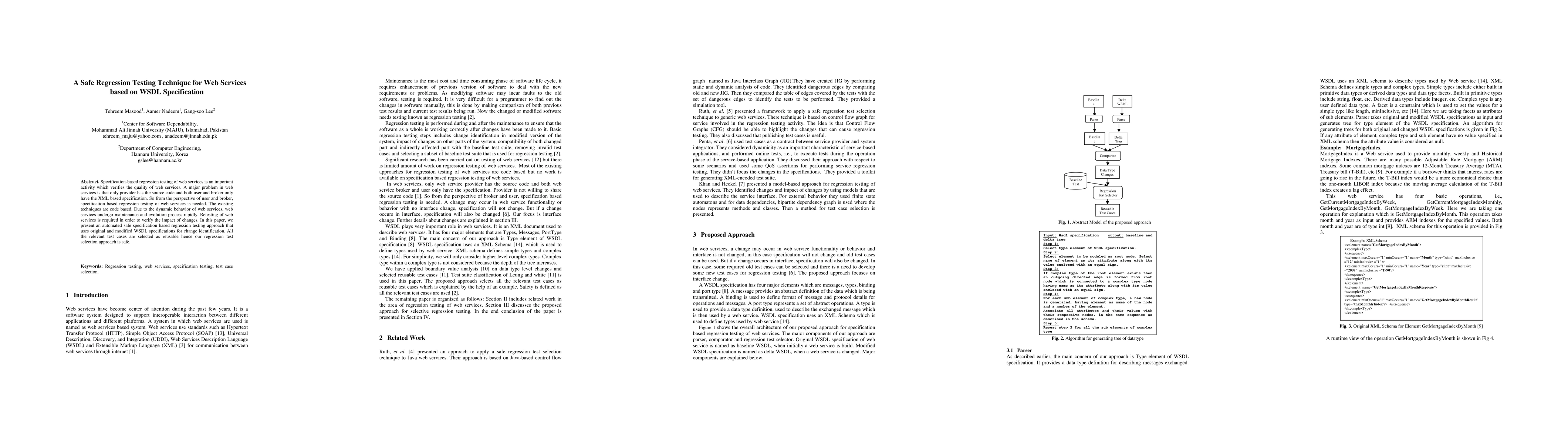 This paper proposes an automated, safe regression testing technique for web services based on WSDL specifications, addressing the challenge of verifying web service quality without access to source code. It introduces a method that identifies changes using original and modified WSDL documents, ensuring that only relevant test cases are reselected for reuse, thus maintaining safety and efficiency.