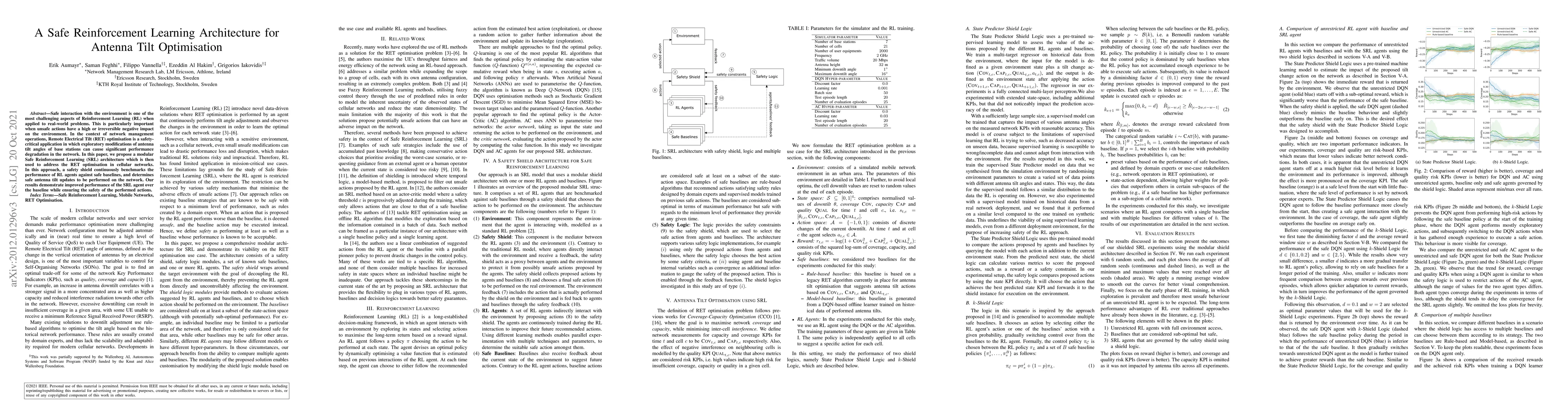 This paper proposes a Safe Reinforcement Learning (SRL) architecture to optimize Remote Electrical Tilt (RET) in cellular networks, ensuring safe antenna tilt adjustments by continuously benchmarking RL agents against safe baselines. The results show improved performance compared to baselines while maintaining safety.