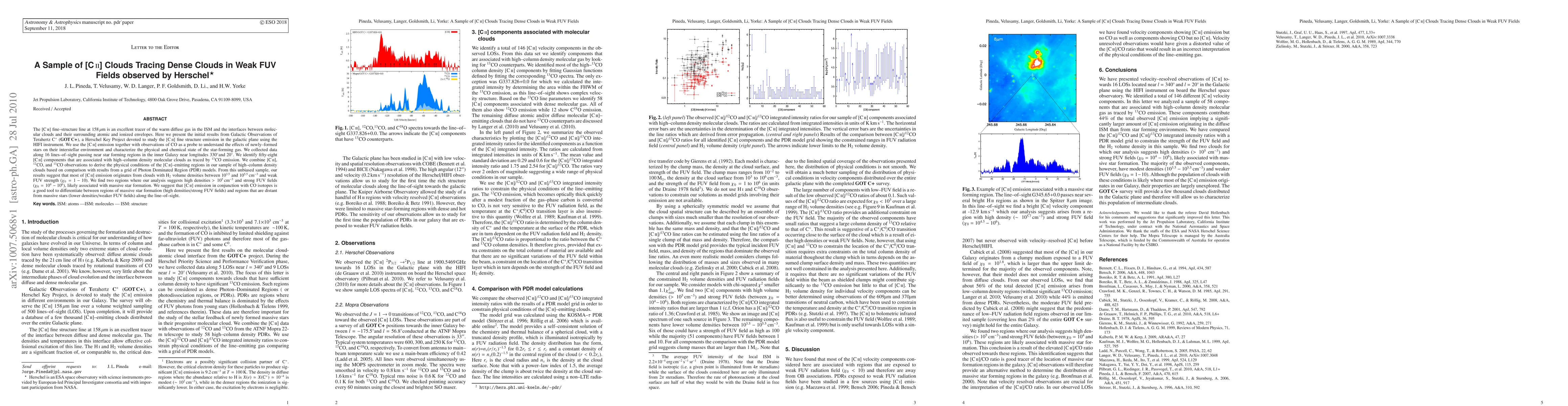The [CII] fine--structure line at 158um is an excellent tracer of the warm diffuse gas in the ISM and the interfaces between molecular clouds and their surrounding atomic and ionized envelopes. Here we present the initial results from Galactic Observations of Terahertz C+ (GOTC+), a Herschel Key Project devoted to study the [CII] fine structure emission in the galactic plane using the HIFI instrument. We use the [CII] emission together with observations of CO as a probe to understand the effects of newly--formed stars on their interstellar environment and characterize the physical and chemical state of the star-forming gas. We collected data along 16 lines--of--sight passing near star forming regions in the inner Galaxy near longitudes 330 degrees and 20 degrees. We identify fifty-eight [CII] components that are associated with high--column density molecular clouds as traced by 13CO emission. We combine [CII], 12CO, and 13CO observations to derive the physical conditions of the [CII]--emitting regions in our sample of high--column density clouds based on comparison with results from a grid of Photon Dominated Region (PDR) models. From this unbiased sample, our results suggest that most of [CII] emission originates from clouds with H2 volume densities between 10e3.5 and 10e5.5 cm^-3 and weak FUV strength (CHI_0=1-10). We find two regions where our analysis suggests high densities >10e5 cm^-3 and strong FUV fields (CHI=10e4-10e6), likely associated with massive star formation. We suggest that [CII] emission in conjunction with CO isotopes is a good tool to differentiate between regions of massive star formation (high densities/strong FUV fields) and regions that are distant from massive stars (lower densities/weaker FUV fields) along the line--of--sight