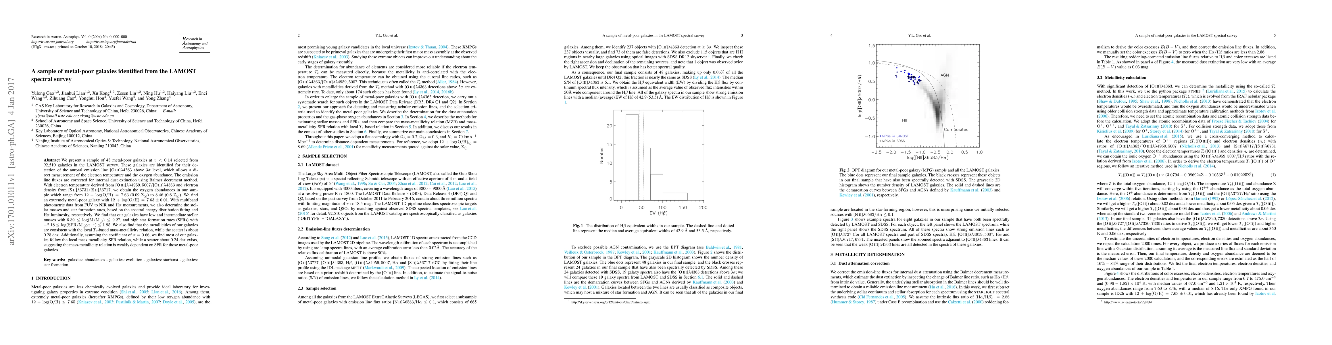We present a sample of 48 metal-poor galaxies at $ z < 0.14$ selected from 92,510 galaxies in the LAMOST survey. These galaxies are identified for their detection of the auroral emission line \oiii$\lambda$4363 above $3\sigma$ level, which allows a direct measurement of the electron temperature and the oxygen abundance. The emission line fluxes are corrected for internal dust extinction using Balmer decrement method. With electron temperature derived from \oiii$\lambda\lambda4959,5007/\oiii\lambda4363$ and electron density from $\sii\lambda6731/\sii\lambda6717$, we obtain the oxygen abundances in our sample which range from $\zoh= 7.63$ (0.09 $\Zsun$) to $8.46$ (0.6 $\Zsun$). We find an extremely metal-poor galaxy with $\zoh=7.63 \pm 0.01$. With multiband photometric data from FUV to NIR and $\ha$ measurements, we also determine the stellar masses and star formation rates, based on the spectral energy distribution fitting and $\ha$ luminosity, respectively. We find that our galaxies have low and intermediate stellar masses with $\rm 6.39 \le log(M/M_{\sun})\le 9.27$, and high star formation rates (SFRs) with $\rm -2.18 \le log(SFR/M_{\sun} yr^{-1}) \le 1.95$. We also find that the metallicities of our galaxies are consistent with the local $T_e$-based mass-metallicity relation, while the scatter is about 0.28 dex. Additionally, assuming the coefficient of $\rm \alpha =0.66$, we find most of our galaxies follow the local mass-metallicity-SFR relation, while a scatter about 0.24 dex exists, suggesting the mass-metallicity relation is weakly dependent on SFR for those metal-poor galaxies.