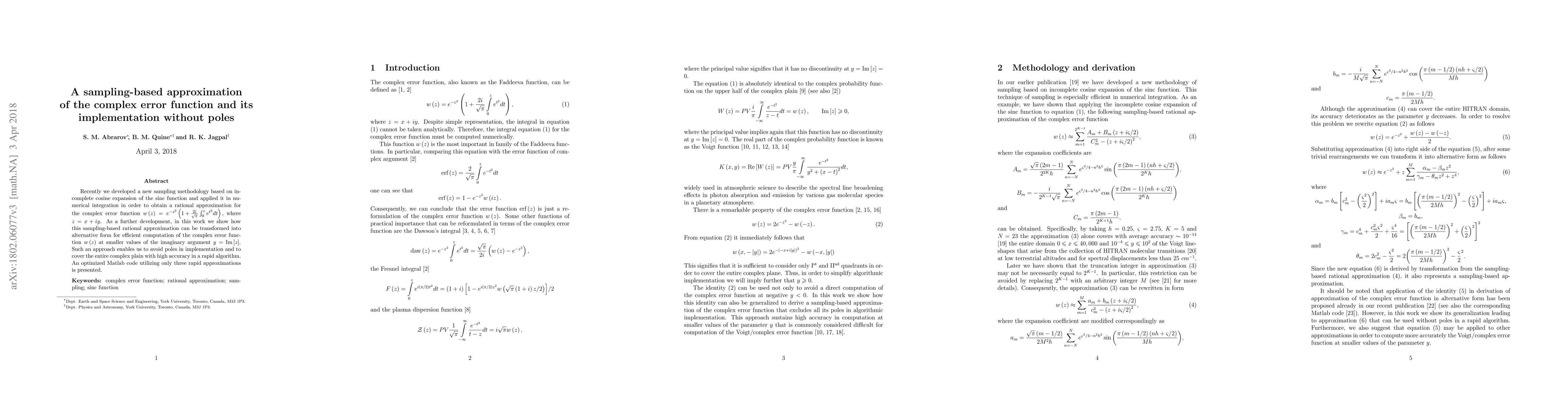This paper introduces a novel sampling-based methodology for rational approximation of the complex error function, avoiding poles in computation. An optimized Matlab code is presented that efficiently computes the function over the entire complex plane using three rapid approximations.