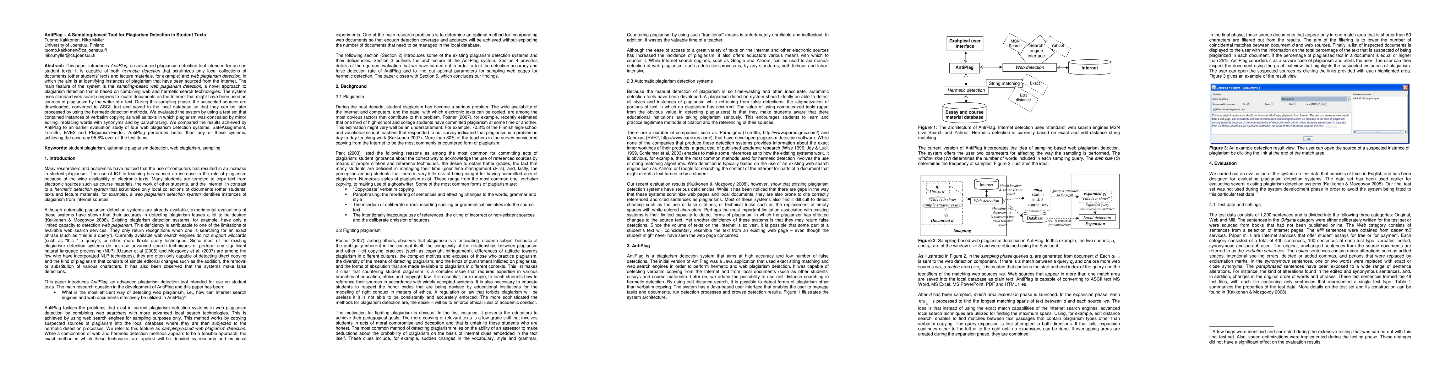 This paper introduces AntiPlag, a plagiarism detection tool for student texts, featuring both local and web plagiarism detection. It employs a novel sampling-based approach for web detection, achieving an accuracy of 95.8% compared to other systems.