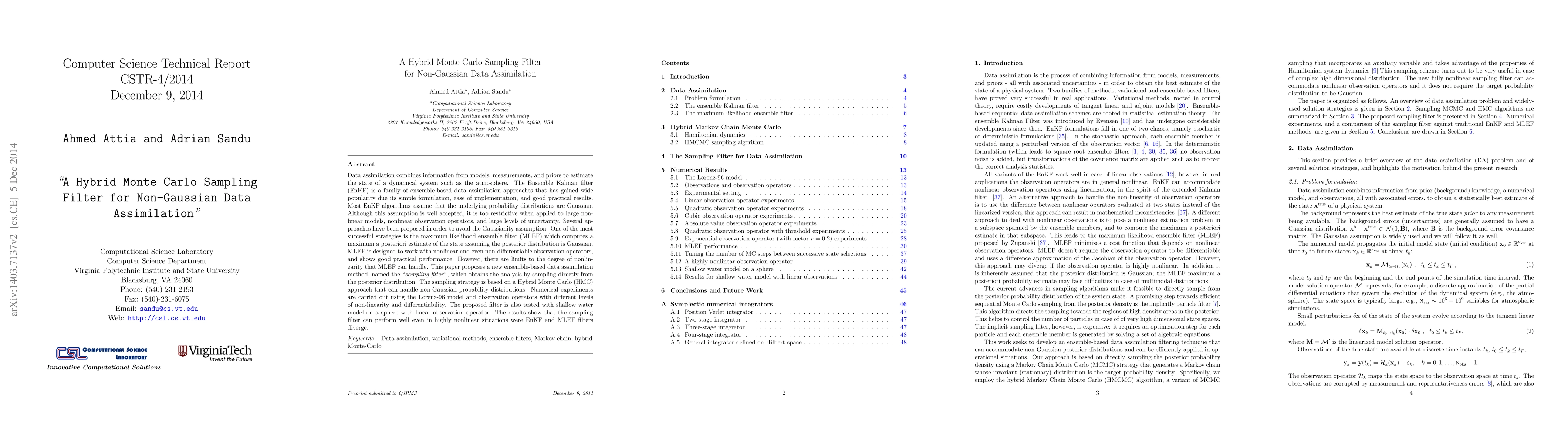 Data assimilation combines information from models, measurements, and priors to estimate the state of a dynamical system such as the atmosphere. The Ensemble Kalman filter (EnKF) is a family of ensemble-based data assimilation approaches that has gained wide popularity due its simple formulation, ease of implementation, and good practical results. Most EnKF algorithms assume that the underlying probability distributions are Gaussian. Although this assumption is well accepted, it is too restrictive when applied to large nonlinear models, nonlinear observation operators, and large levels of uncertainty. Several approaches have been proposed in order to avoid the Gaussianity assumption. One of the most successful strategies is the maximum likelihood ensemble filter (MLEF) which computes a maximum a posteriori estimate of the state assuming the posterior distribution is Gaussian. MLEF is designed to work with nonlinear and even non-differentiable observation operators, and shows good practical performance. However, there are limits to the degree of nonlinearity that MLEF can handle. This paper proposes a new ensemble-based data assimilation method, named the "sampling filter", which obtains the analysis by sampling directly from the posterior distribution. The sampling strategy is based on a Hybrid Monte Carlo (HMC) approach that can handle non-Gaussian probability distributions. Numerical experiments are carried out using the Lorenz-96 model and observation operators with different levels of non-linearity and differentiability. The proposed filter is also tested with shallow water model on a sphere with linear observation operator. The results show that the sampling filter can perform well even in highly nonlinear situations were EnKF and MLEF filters diverge.