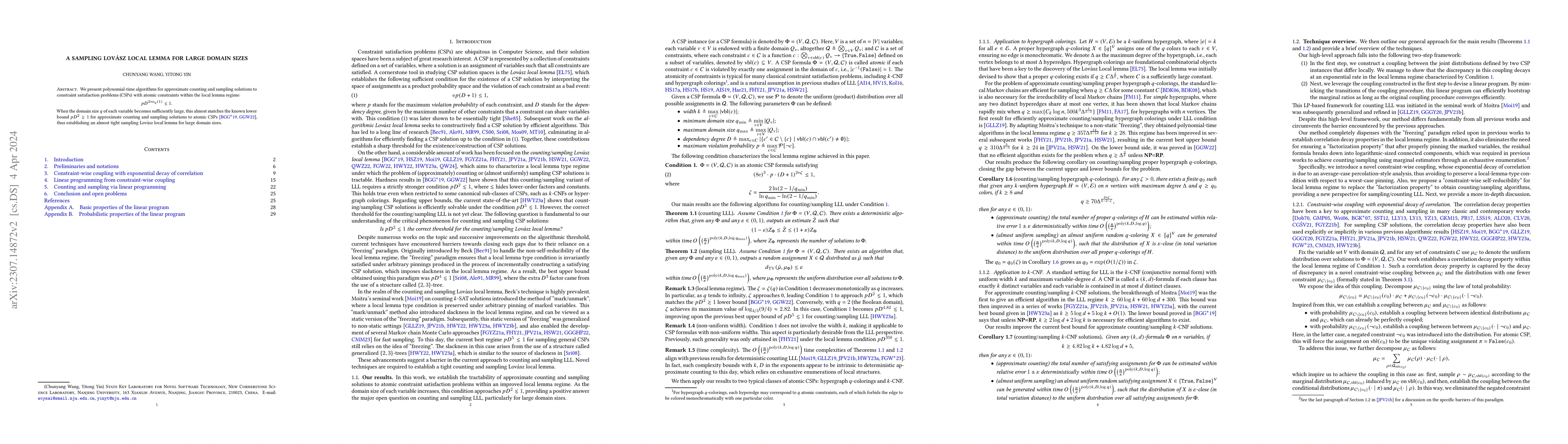 The paper proposes polynomial-time algorithms for approximate counting and sampling solutions to constraint satisfaction problems within the local lemma regime, nearly matching known lower bounds when domain sizes are sufficiently large. It establishes an almost tight sampling Lovász local lemma for large domain sizes.
