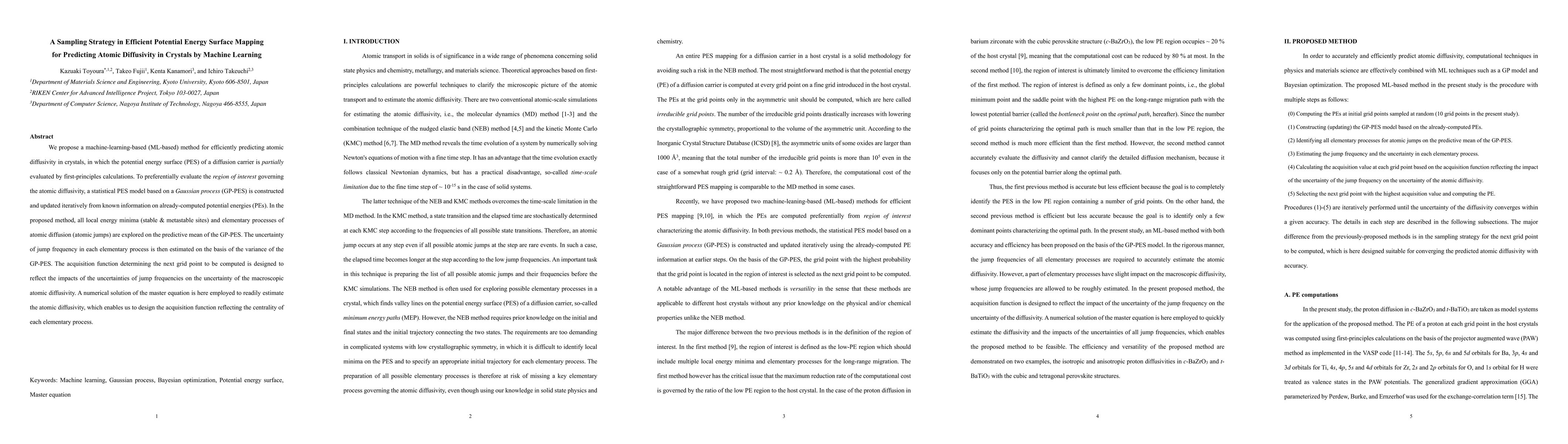 We propose a machine-learning-based (ML-based) method for efficiently predicting atomic diffusivity in crystals, in which the potential energy surface (PES) of a diffusion carrier is partially evaluated by first-principles calculations. To preferentially evaluate the region of interest governing the atomic diffusivity, a statistical PES model based on a Gaussian process (GP-PES) is constructed and updated iteratively from known information on already-computed potential energies (PEs). In the proposed method, all local energy minima (stable & metastable sites) and elementary processes of atomic diffusion (atomic jumps) are explored on the predictive mean of the GP-PES. The uncertainty of jump frequency in each elementary process is then estimated on the basis of the variance of the GP-PES. The acquisition function determining the next grid point to be computed is designed to reflect the impacts of the uncertainties of jump frequencies on the uncertainty of the macroscopic atomic diffusivity. The numerical solution of the master equation is here employed to readily estimate the atomic diffusivity, which enables us to design the acquisition function reflecting the centrality of each elementary process.