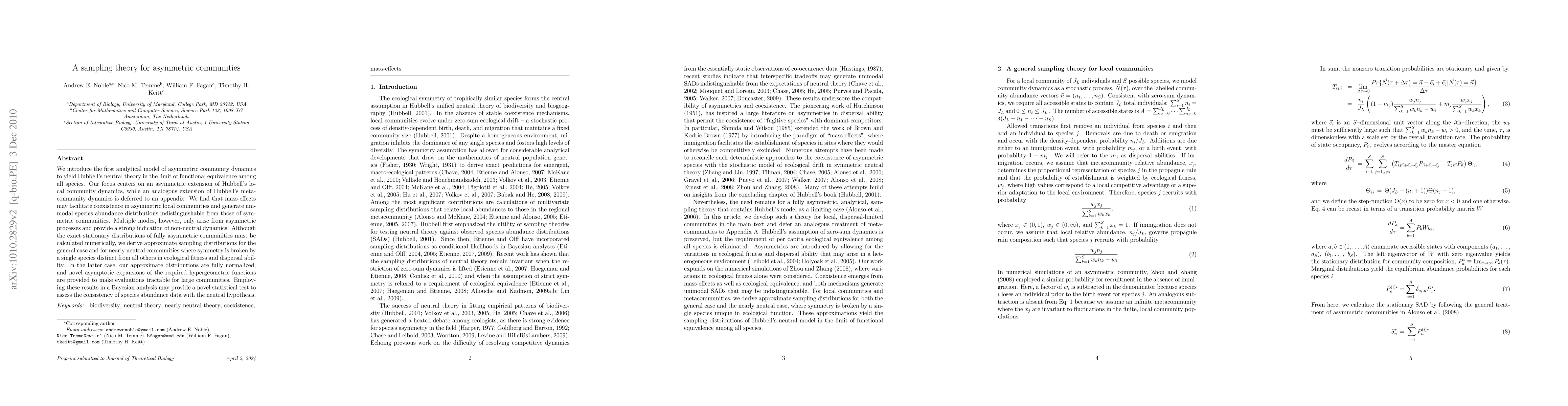 We introduce the first analytical model of asymmetric community dynamics to yield Hubbell's neutral theory in the limit of functional equivalence among all species. Our focus centers on an asymmetric extension of Hubbell's local community dynamics, while an analogous extension of Hubbell's metacommunity dynamics is deferred to an appendix. We find that mass-effects may facilitate coexistence in asymmetric local communities and generate unimodal species abundance distributions indistinguishable from those of symmetric communities. Multiple modes, however, only arise from asymmetric processes and provide a strong indication of non-neutral dynamics. Although the exact stationary distributions of fully asymmetric communities must be calculated numerically, we derive approximate sampling distributions for the general case and for nearly neutral communities where symmetry is broken by a single species distinct from all others in ecological fitness and dispersal ability. In the latter case, our approximate distributions are fully normalized, and novel asymptotic expansions of the required hypergeometric functions are provided to make evaluations tractable for large communities. Employing these results in a Bayesian analysis may provide a novel statistical test to assess the consistency of species abundance data with the neutral hypothesis.