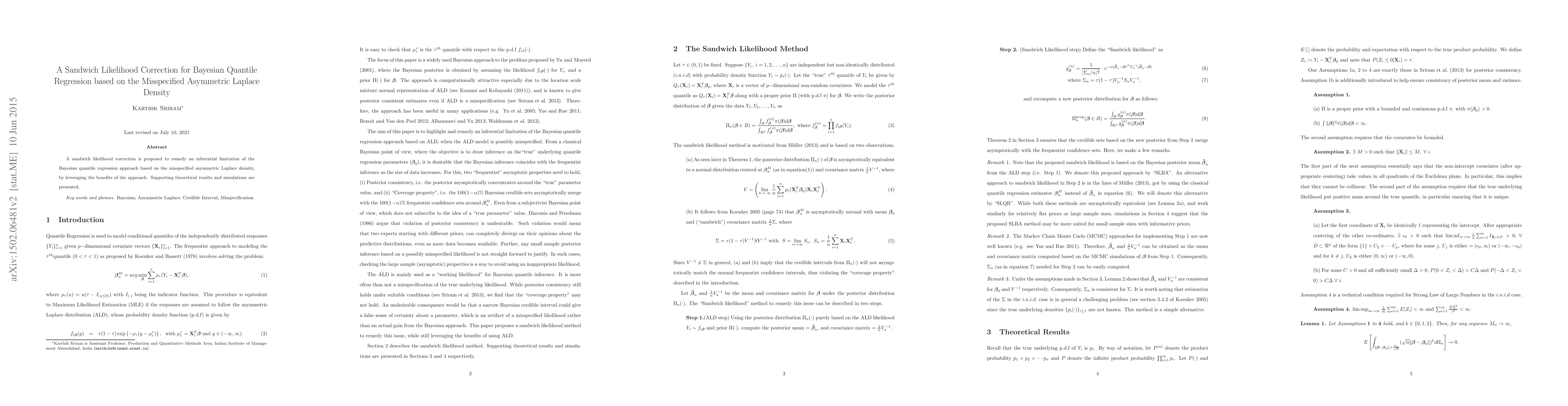 This paper proposes a sandwich likelihood correction to address inferential issues in Bayesian quantile regression when the asymmetric Laplace density is misspecified, providing theoretical support and simulation results to validate the method.