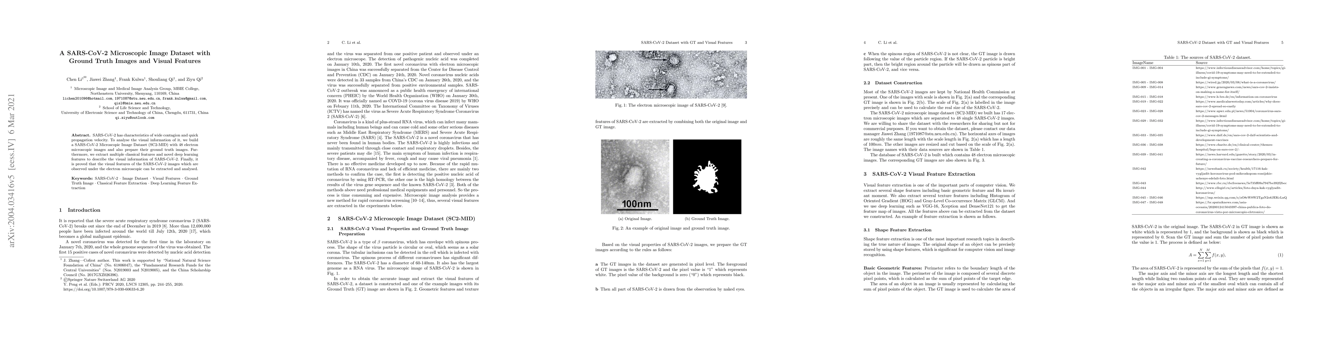 SARS-CoV-2 has characteristics of wide contagion and quick propagation velocity. To analyse the visual information of it, we build a SARS-CoV-2 Microscopic Image Dataset (SC2-MID) with 48 electron microscopic images and also prepare their ground truth images. Furthermore, we extract multiple classical features and novel deep learning features to describe the visual information of SARS-CoV-2. Finally, it is proved that the visual features of the SARS-CoV-2 images which are observed under the electron microscopic can be extracted and analysed.
