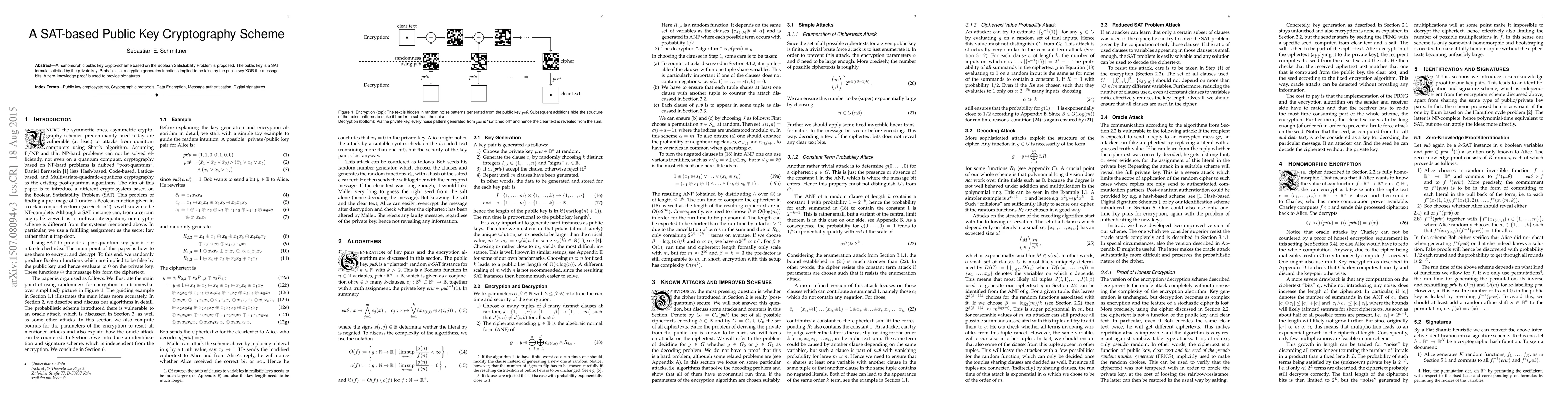 A new public key cryptography scheme based on the Boolean Satisfiability Problem is proposed, enabling secure encryption and signature verification without revealing private keys.