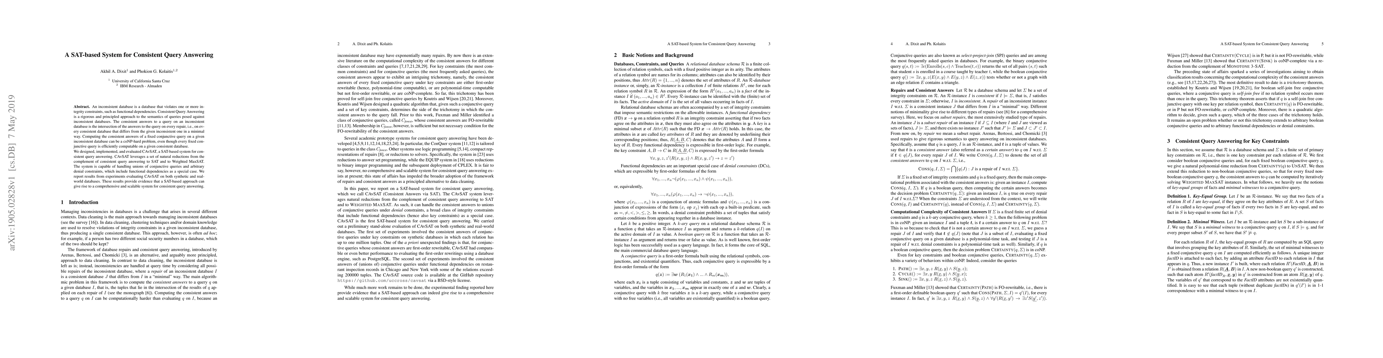 The paper presents CAvSAT, a SAT-based system for consistent query answering in inconsistent databases. CAvSAT uses natural reductions to convert the problem into SAT and Weighted MaxSAT instances, handling unions of conjunctive queries and arbitrary denial constraints.