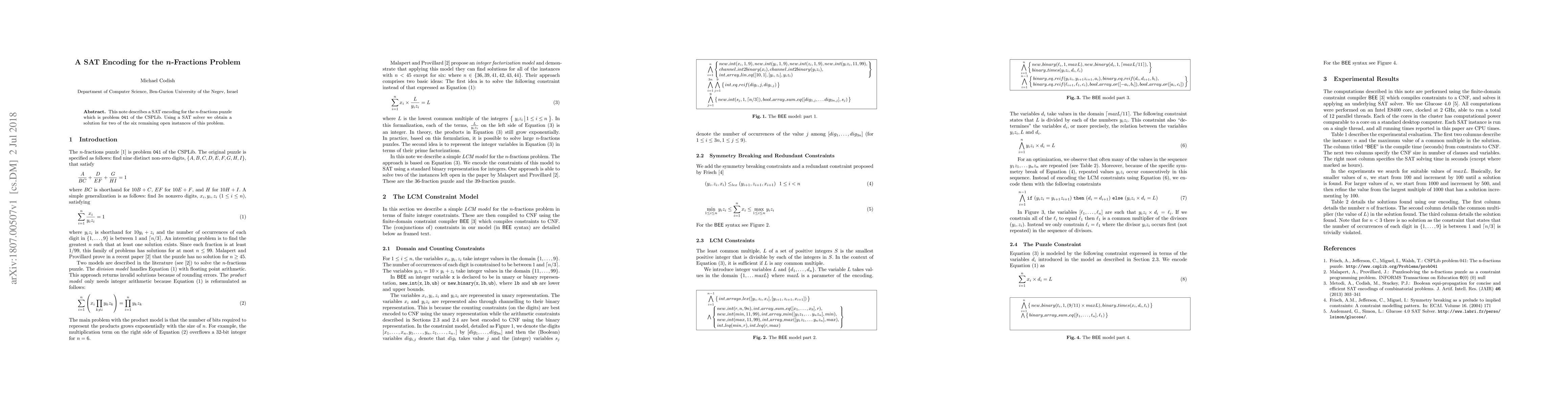 This note describes a SAT encoding for the $n$-fractions puzzle which is problem 041 of the CSPLib. Using a SAT solver we obtain a solution for two of the six remaining open instances of this problem.