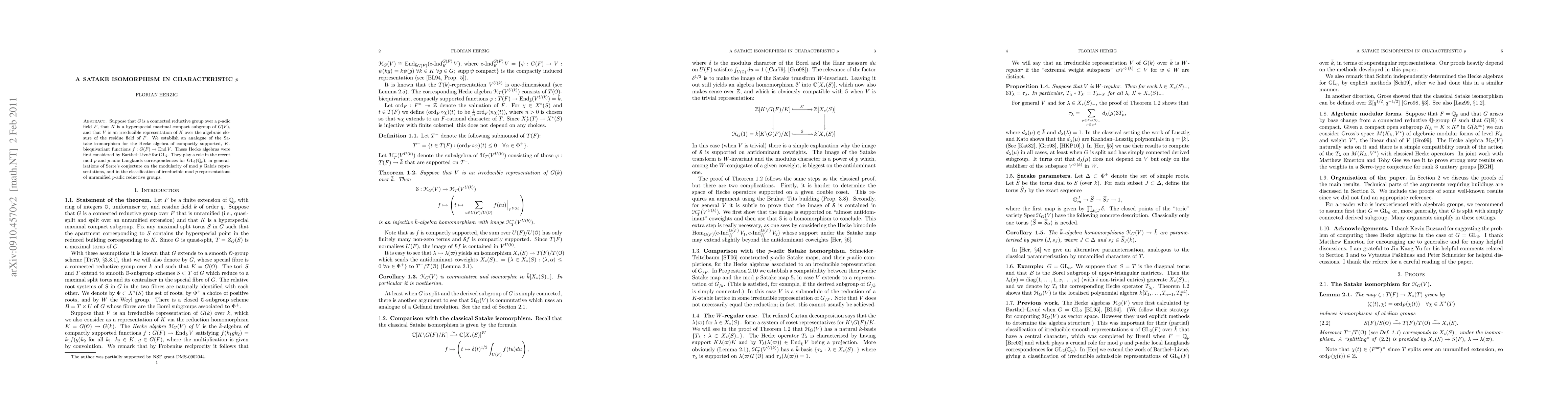 This research paper presents an analogue of the Satake isomorphism for Hecke algebras of compactly supported, K-bi-equivariant functions on p-adic fields. The study focuses on connected reductive groups, hyperspecial maximal compact subgroups, and irreducible representations over algebraic closures of residue fields. The findings contribute to the mod p and p-adic Langlands correspondences for GL_2(Q_p), generalizations of Serre's conjecture, and classification of irreducible mod p representations of unramified p-adic reductive groups.