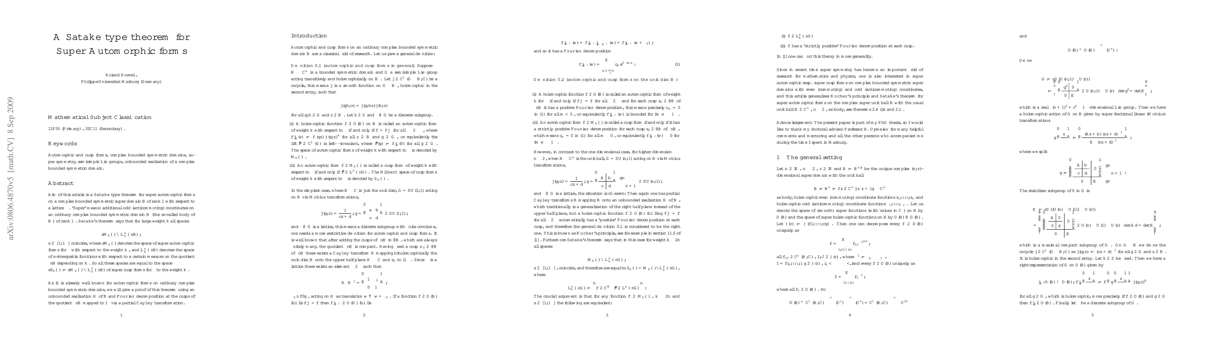 Aim of this article is a Satake type theorem for super automorphic forms on a complex bounded symmetric super domain B of rank 1 with respect to a lattice. This theorem - roughly speaking - says that for large weight k and all p from 1 to infinity (both including) a super automorphic form on B is a super cusp form if and only if its p-norm with respect to a certain measure on the quotient of B is finite. And so in particular all these Lp-spaces coincide! We will give a proof of this theorem using an unbounded realization of B and Fourier decomposition at the cusps of the quotient mapped to infinity via a partial Cayley transform.