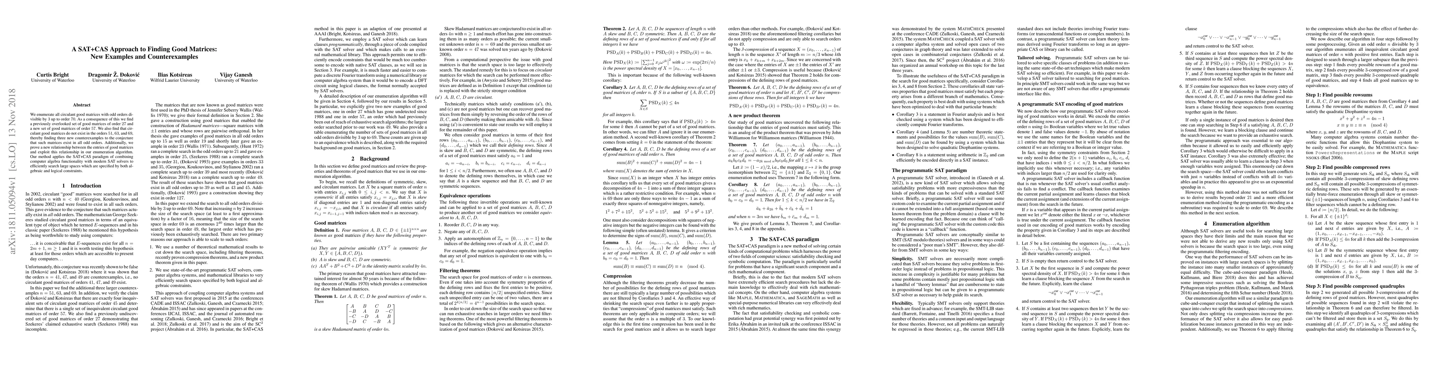 Researchers found new examples of good matrices with odd orders divisible by 3 up to 70, including previously overlooked sets for order 27 and a new set for 57, as well as three counterexamples that disprove the existence of such matrices in certain orders.