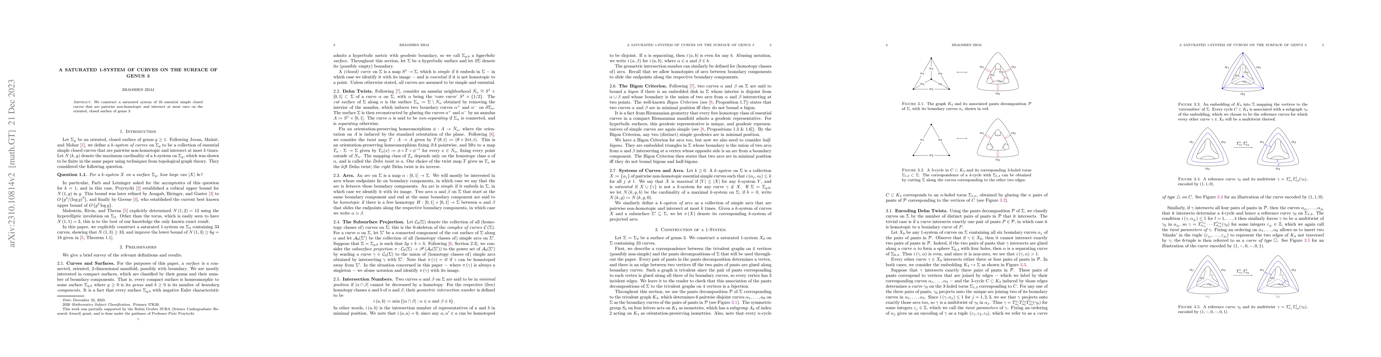 Summary: This paper constructs a saturated system of 33 essential simple closed curves on a genus 3 surface, ensuring they are pairwise non-homotopic and intersect at most once. This provides a significant configuration for studying the topology of surfaces.