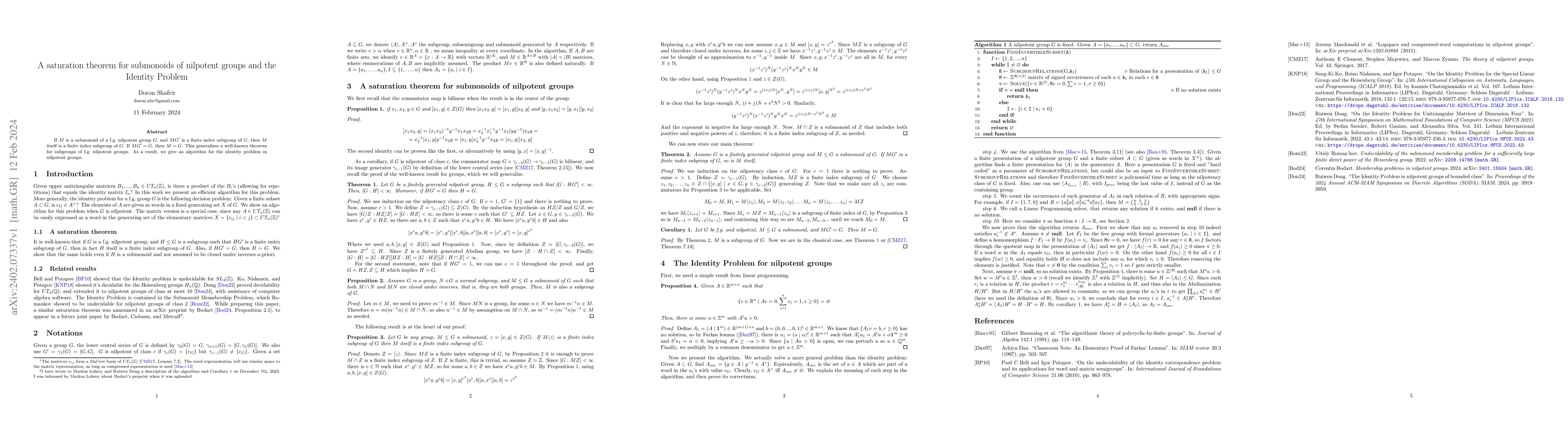 This paper proves a saturation theorem for submonoids in nilpotent groups, showing that if a submonoid's associated subgroup has finite index in the group, then the submonoid itself has finite index. It also provides an algorithm to solve the Identity Problem in nilpotent groups.