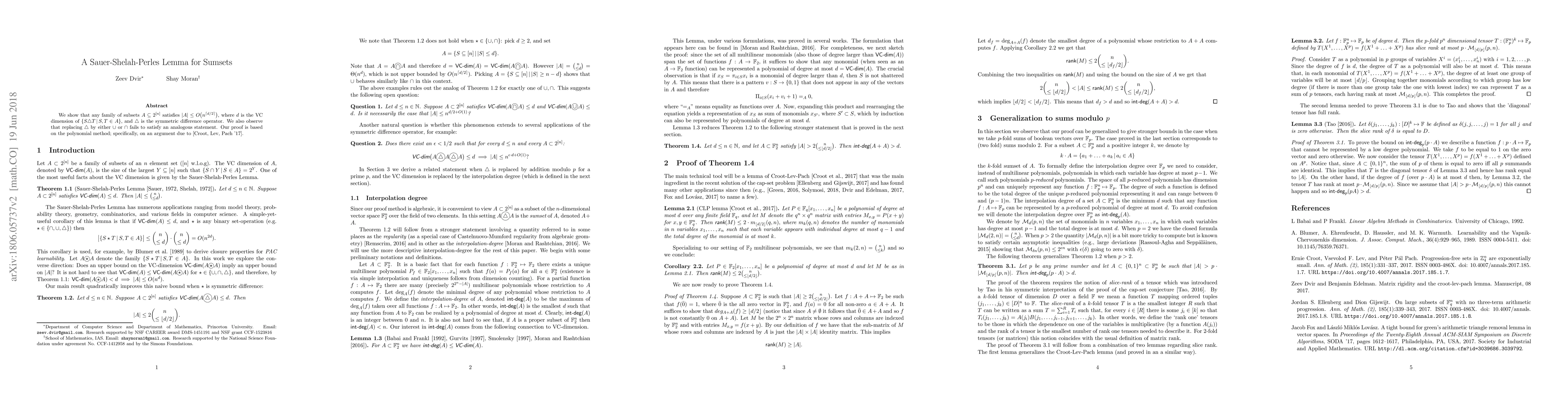 This paper proves a Sauer-Shelah-Perles lemma for sumsets, showing that any subset family $A\subseteq 2^{[n]}$ has size bounded by $O(n^{\lceil{d}/{2}\rceil})$, where $d$ is the VC dimension of the symmetric differences of sets in $A$. The proof leverages the polynomial method, specifically the argument from Croot, Lev, and Pach.