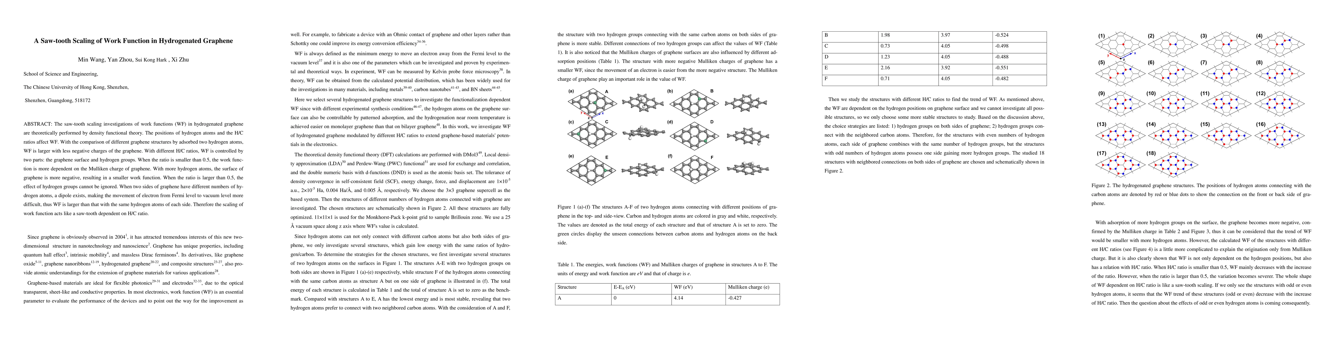 This study theoretically investigates the saw-tooth scaling of work functions in hydrogenated graphene using density functional theory, showing that positions and ratios of hydrogen atoms significantly influence the work function, with differing effects based on H/C ratios. The work function varies depending on the graphene surface and hydrogen groups, creating a saw-tooth pattern with respect to hydrogenation.