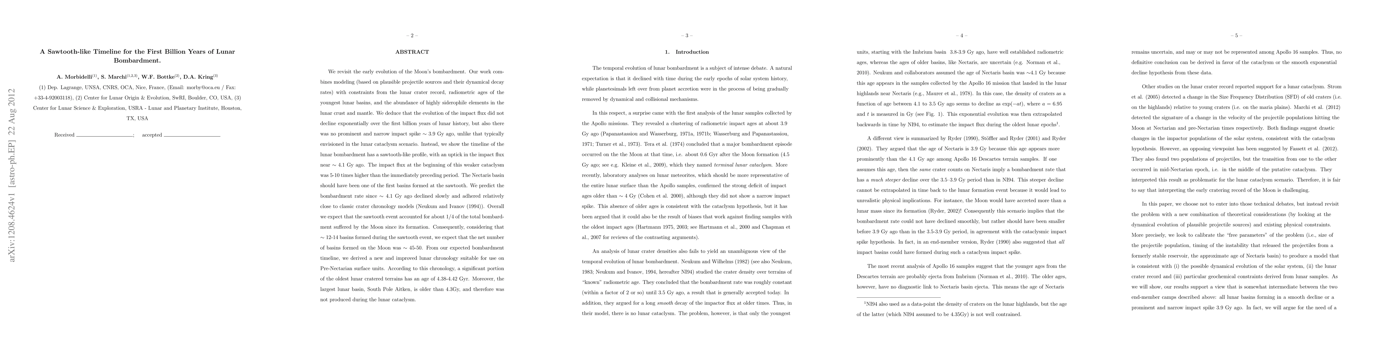 This research proposes a sawtooth-like timeline for the Moon's bombardment during its first billion years, characterized by an uptick in impact flux around 4.1 Gy ago, rather than a narrow spike. The study suggests that the bombardment rate declined slowly thereafter, leading to a revised lunar chronology.