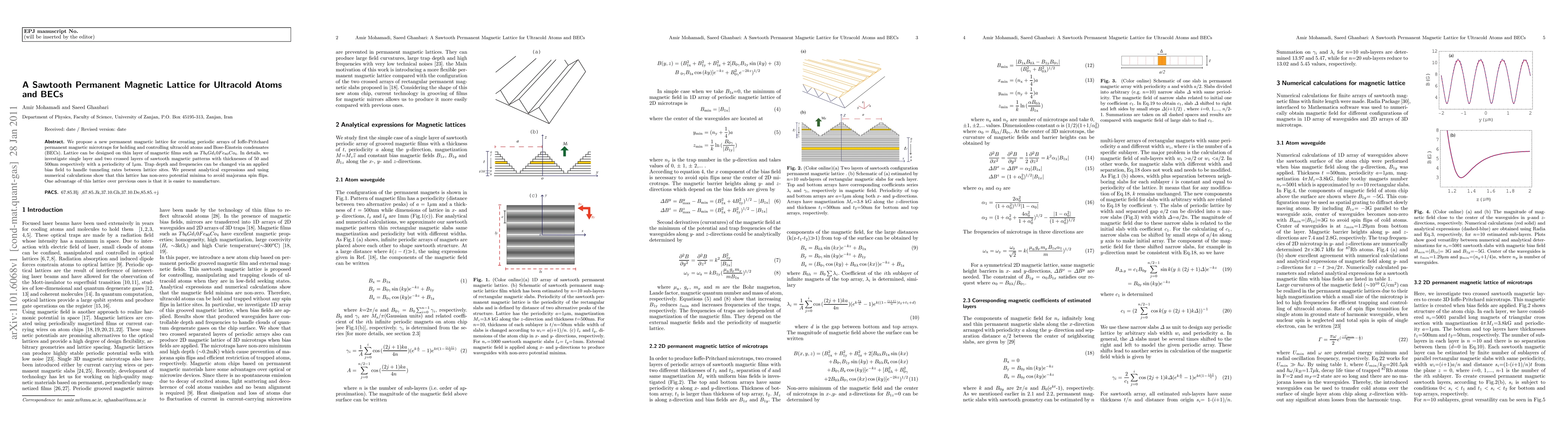 Summary: This paper proposes a new sawtooth permanent magnetic lattice using thin magnetic films to create microtraps for ultracold atoms and BECs. The design includes single and crossed sawtooth patterns, with adjustable trap depth and frequencies, and avoids Majorana spin flips, presenting an easier manufacturing process compared to previous lattices.