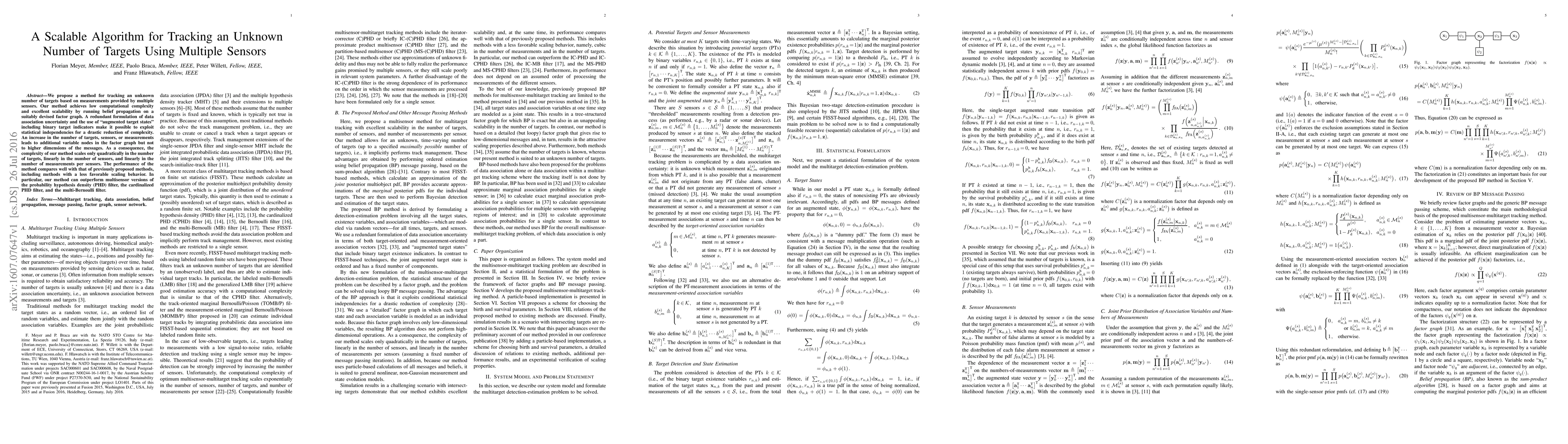 This paper introduces a scalable algorithm for tracking an unknown number of targets using multiple sensors, employing belief propagation on a factor graph to reduce computational complexity. The method scales quadratically with targets, linearly with sensors and measurements, and outperforms other tracking methods.