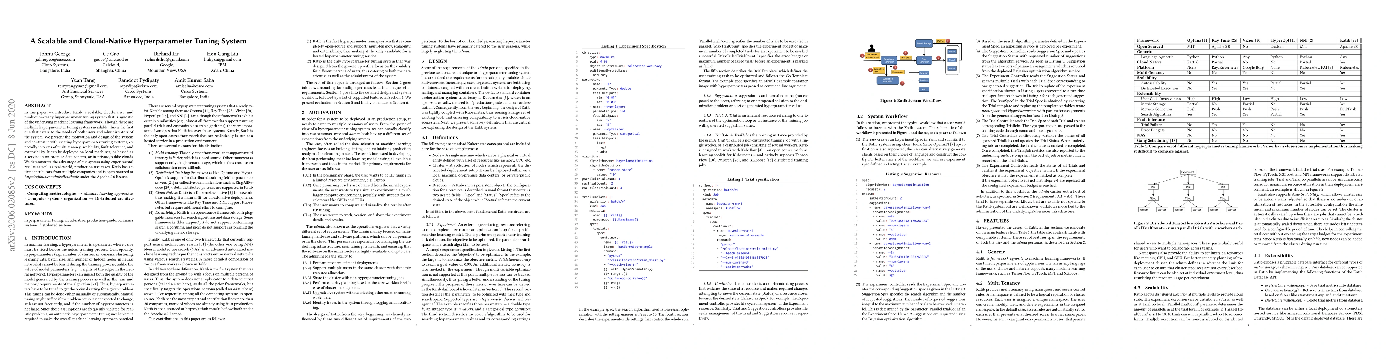 This paper introduces Katib, a scalable, cloud-native hyperparameter tuning system that supports multiple machine learning frameworks. It emphasizes multi-tenancy, scalability, fault-tolerance, and extensibility, demonstrating its advantages through experiments and real-world use cases.