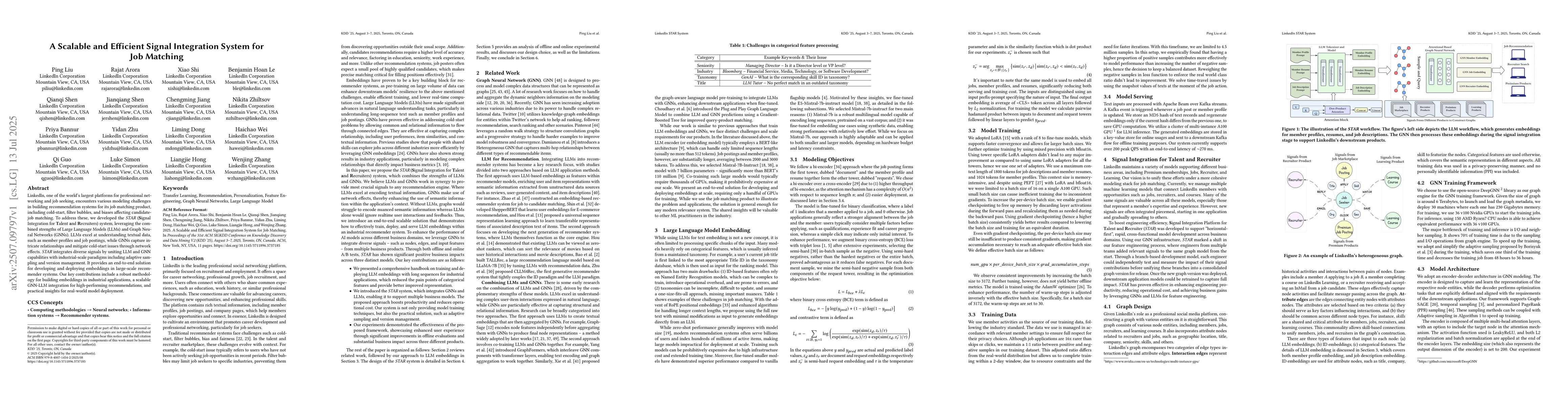 LinkedIn, one of the world's largest platforms for professional networking and job seeking, encounters various modeling challenges in building recommendation systems for its job matching product, including cold-start, filter bubbles, and biases affecting candidate-job matching. To address these, we developed the STAR (Signal Integration for Talent And Recruiters) system, leveraging the combined strengths of Large Language Models (LLMs) and Graph Neural Networks (GNNs). LLMs excel at understanding textual data, such as member profiles and job postings, while GNNs capture intricate relationships and mitigate cold-start issues through network effects. STAR integrates diverse signals by uniting LLM and GNN capabilities with industrial-scale paradigms including adaptive sampling and version management. It provides an end-to-end solution for developing and deploying embeddings in large-scale recommender systems. Our key contributions include a robust methodology for building embeddings in industrial applications, a scalable GNN-LLM integration for high-performing recommendations, and practical insights for real-world model deployment.