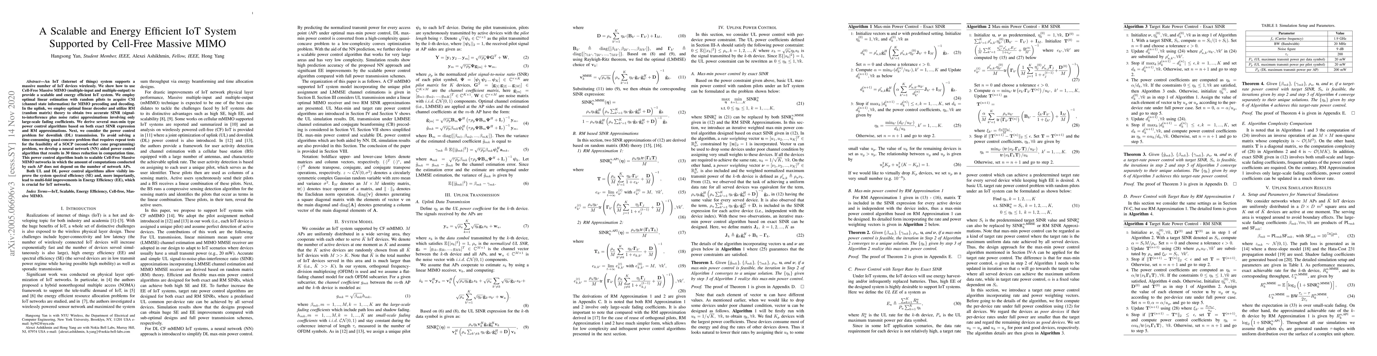 An IoT (Internet of things) system supports a massive number of IoT devices wirelessly. We show how to use Cell-Free Massive MIMO (multiple-input and multiple-output) to provide a scalable and energy efficient IoT system. We employ optimal linear estimation with random pilots to acquire CSI (channel state information) for MIMO precoding and decoding. In the uplink, we employ optimal linear decoder and utilize RM (random matrix) theory to obtain two accurate SINR (signal-to-interference plus noise ratio) approximations involving only large-scale fading coefficients. We derive several max-min type power control algorithms based on both exact SINR expression and RM approximations. Next, we consider the power control problem for downlink (DL) transmission. To avoid solving a time-consuming quasi-concave problem that requires repeat tests for the feasibility of a SOCP (second-order cone programming) problem, we develop a neural network (NN) aided power control algorithm that results in 30 times reduction in computation time. This power control algorithm leads to scalable Cell-Free Massive MIMO networks in which the amount of computations conducted by each AP does not depend on the number of network APs. Both UL and DL power control algorithms allow visibly improve the system spectral efficiency (SE) and, more importantly, lead to multi-fold improvements in Energy Efficiency (EE), which is crucial for IoT networks.