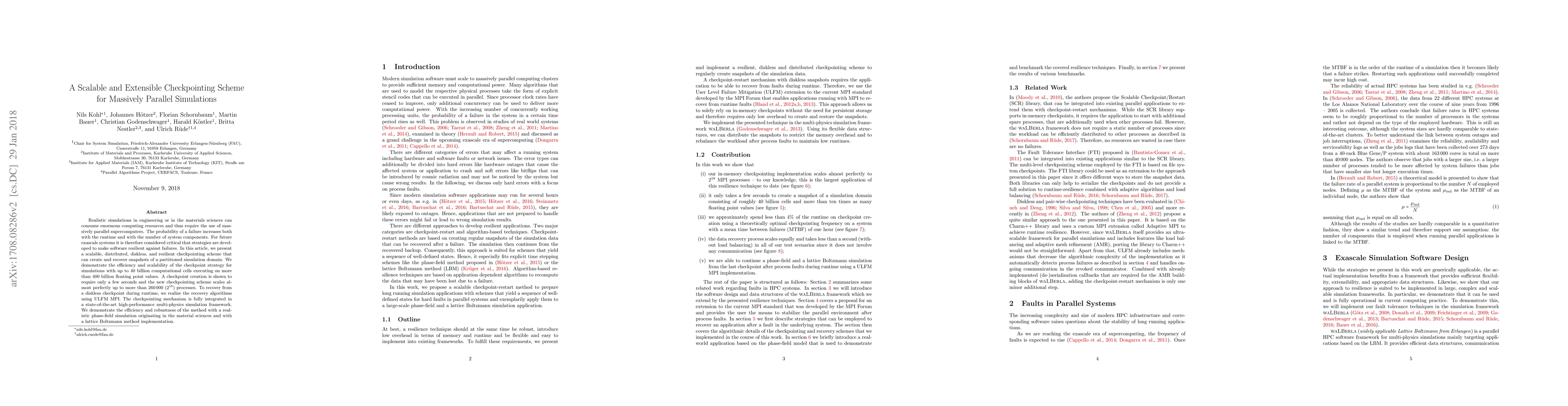 This paper introduces a scalable, distributed, and diskless checkpointing scheme for massively parallel simulations, demonstrating its efficiency and scalability for simulations with up to 40 billion computational cells. The method effectively handles failures in future exascale systems and integrates seamlessly with high-performance multi-physics simulation frameworks.