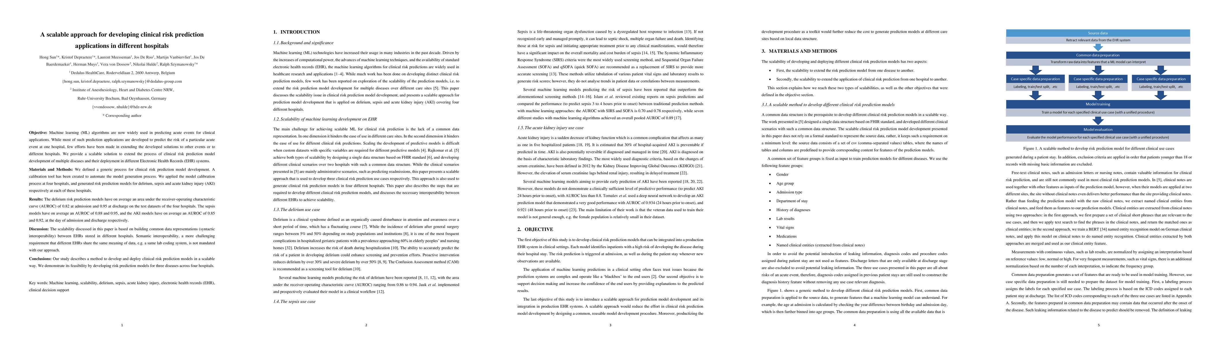 This paper presents a scalable method for developing clinical risk prediction models for multiple diseases across different hospitals, achieving high AUROC scores for delirium, sepsis, and acute kidney injury. The approach focuses on syntactic interoperability between Electronic Health Records but does not address semantic interoperability.