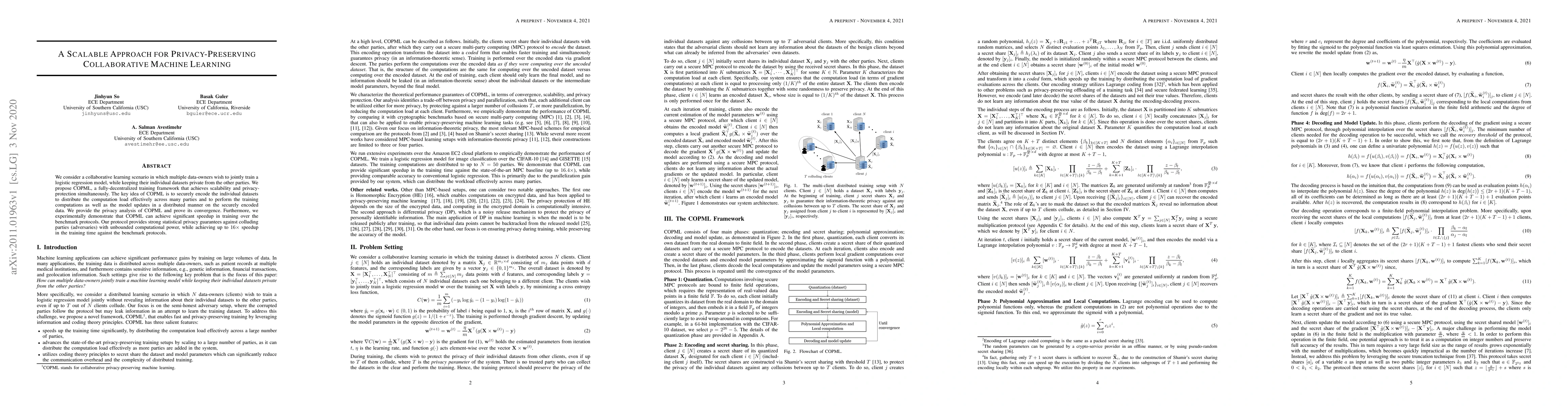 We consider a collaborative learning scenario in which multiple data-owners wish to jointly train a logistic regression model, while keeping their individual datasets private from the other parties. We propose COPML, a fully-decentralized training framework that achieves scalability and privacy-protection simultaneously. The key idea of COPML is to securely encode the individual datasets to distribute the computation load effectively across many parties and to perform the training computations as well as the model updates in a distributed manner on the securely encoded data. We provide the privacy analysis of COPML and prove its convergence. Furthermore, we experimentally demonstrate that COPML can achieve significant speedup in training over the benchmark protocols. Our protocol provides strong statistical privacy guarantees against colluding parties (adversaries) with unbounded computational power, while achieving up to $16\times$ speedup in the training time against the benchmark protocols.