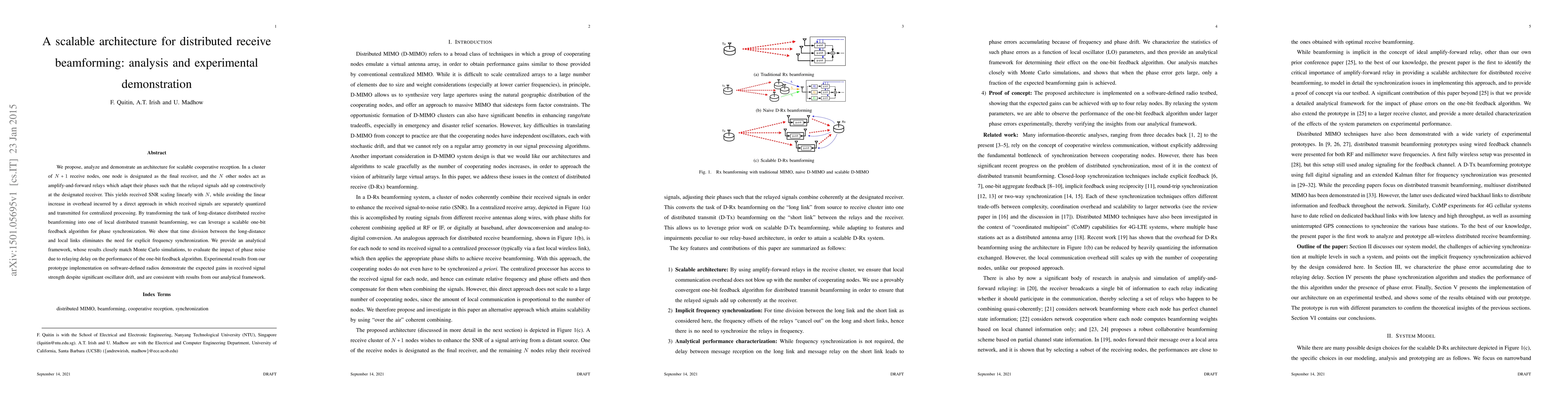 This paper proposes a scalable architecture for distributed receive beamforming, where N+1 nodes cooperatively relay signals to a designated receiver, achieving linear SNR scaling with N. The architecture avoids overhead from centralized processing and leverages a one-bit feedback algorithm for phase synchronization, demonstrating performance gains in prototype experiments.