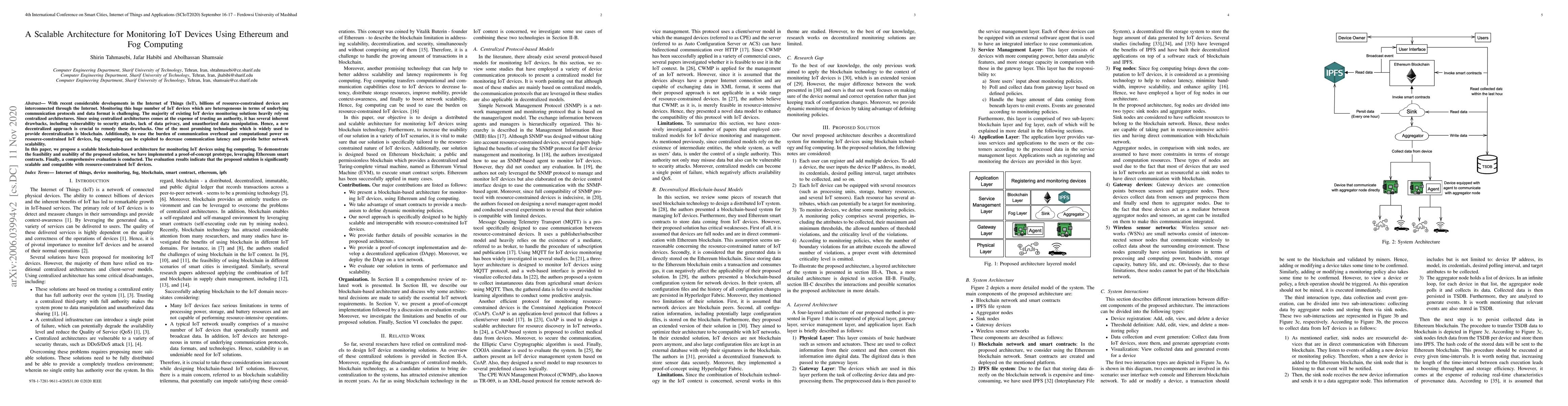 This paper proposes a scalable architecture for monitoring IoT devices using a decentralized blockchain approach with Ethereum and fog computing to address the challenges of centralized monitoring solutions. The implemented prototype demonstrates the feasibility and scalability of the proposed solution, showing compatibility with resource-constrained IoT devices.