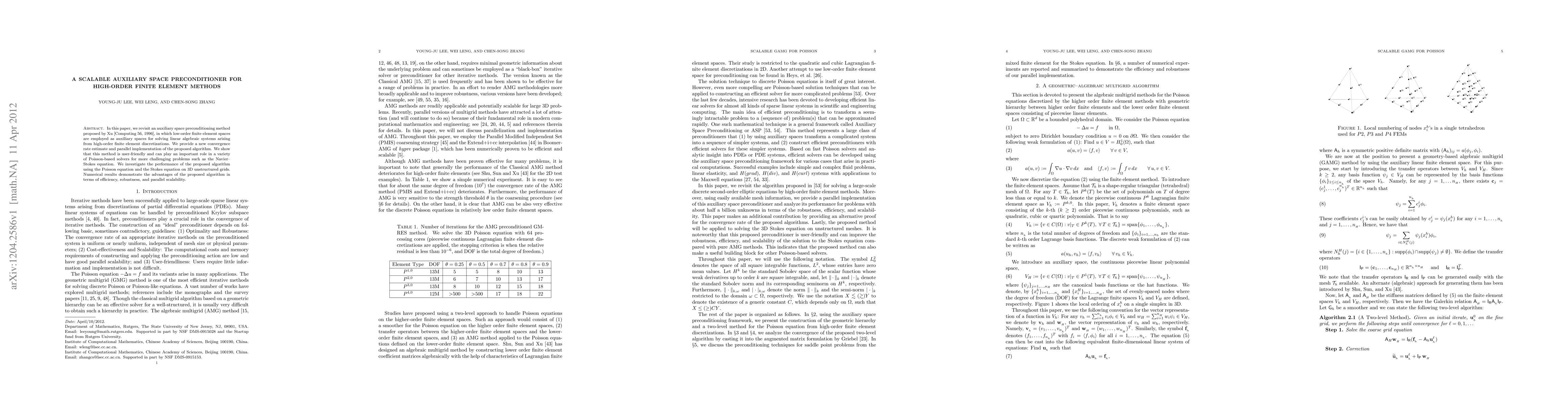 In this paper, we revisit an auxiliary space preconditioning method proposed by Xu [Computing 56, 1996], in which low-order finite element spaces are employed as auxiliary spaces for solving linear algebraic systems arising from high-order finite element discretizations. We provide a new convergence rate estimate and parallel implementation of the proposed algorithm. We show that this method is user-friendly and can play an important role in a variety of Poisson-based solvers for more challenging problems such as the Navier--Stokes equation. We investigate the performance of the proposed algorithm using the Poisson equation and the Stokes equation on 3D unstructured grids. Numerical results demonstrate the advantages of the proposed algorithm in terms of efficiency, robustness, and parallel scalability.