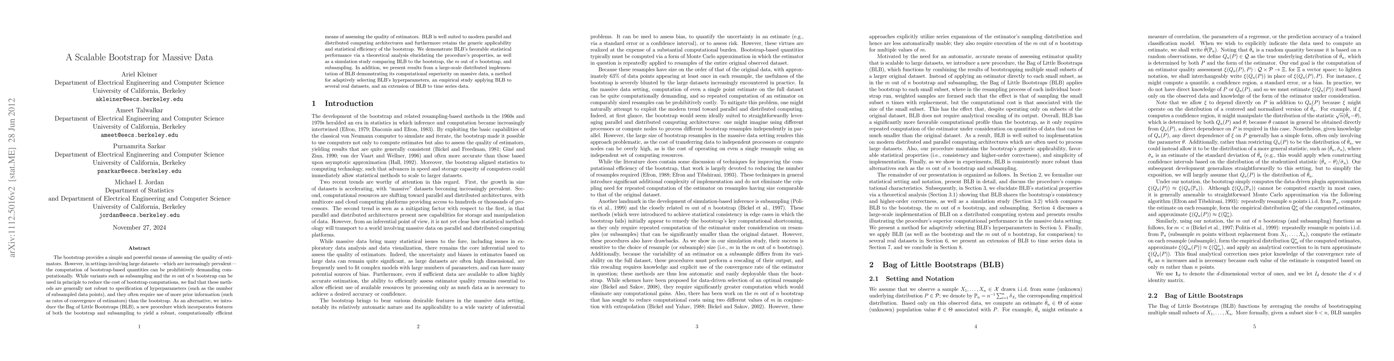 The paper introduces the Bag of Little Bootstraps (BLB), a scalable bootstrap method designed to efficiently assess estimator quality in large datasets. BLB combines the robustness of the bootstrap with the computational efficiency of subsampling, demonstrating superior performance in both theoretical analysis and practical applications on massive data.