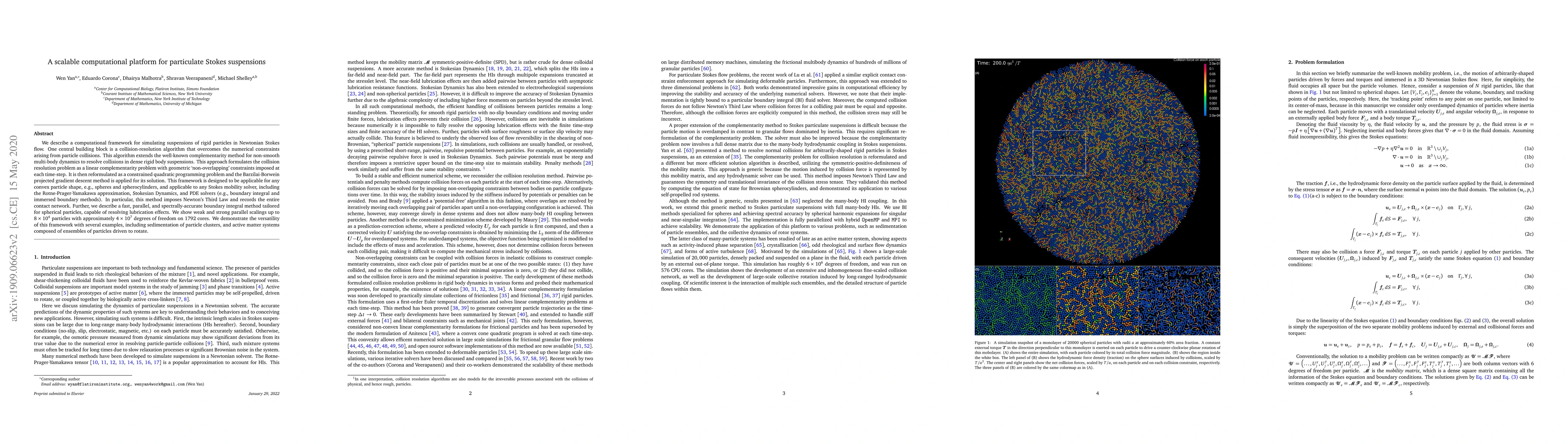 This paper presents a scalable computational framework for simulating suspensions of rigid particles in Newtonian Stokes flow, featuring a collision-resolution algorithm based on linear complementarity and projected gradient descent. The framework supports various particle shapes and mobility solvers, demonstrating strong parallel scaling up to millions of particles.