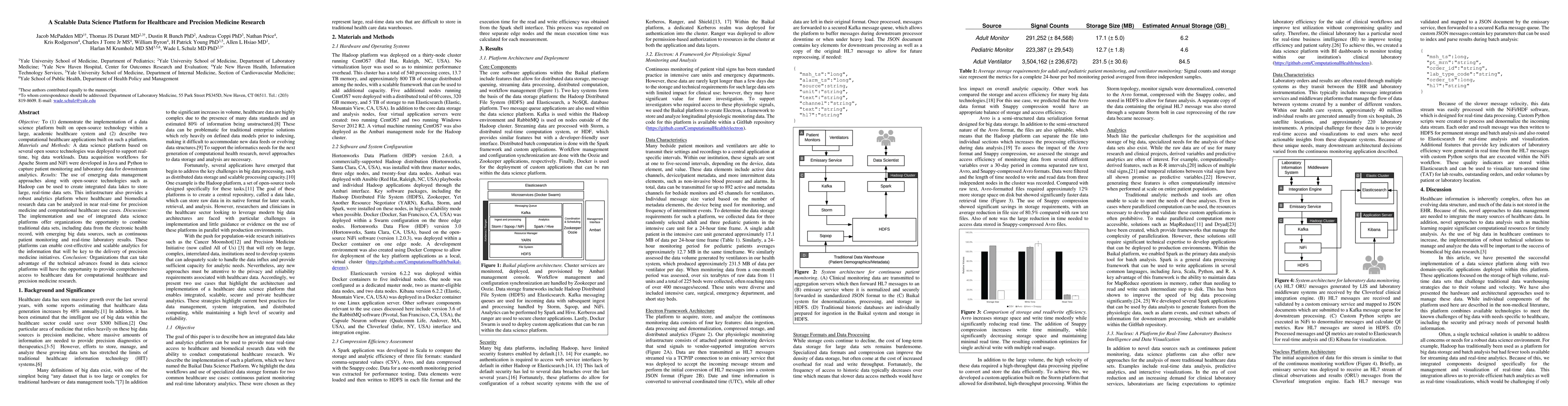 This research demonstrates the implementation of a scalable data science platform using open-source technologies in a large academic healthcare system, showcasing its use for real-time big data analytics and two computational healthcare applications. The platform integrates traditional and emerging big data sources, enabling cost-effective and scalable analytics for precision medicine.