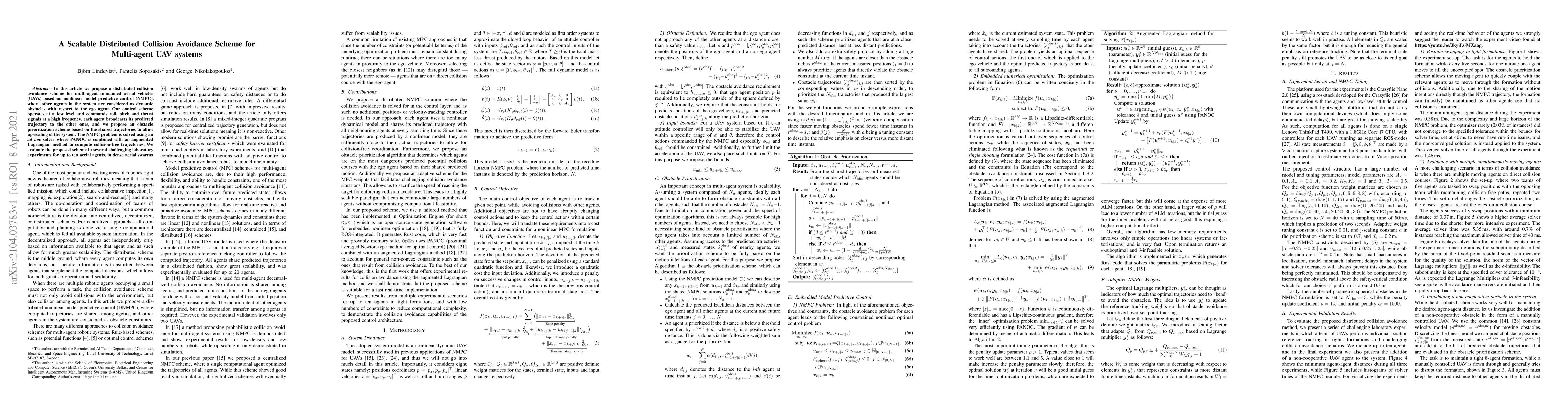 This paper proposes a scalable distributed collision avoidance scheme for multi-agent UAV systems using nonlinear model predictive control (NMPC) and an augmented Lagrangian method. The approach involves each UAV broadcasting its predicted trajectory and employing an obstacle prioritization scheme to manage dynamic obstacles.