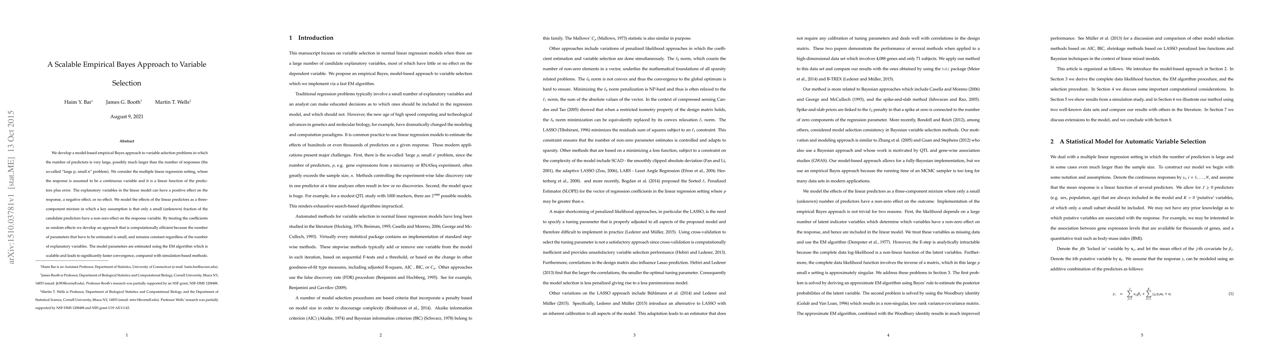 This paper proposes a scalable empirical Bayes method for variable selection in high-dimensional multiple linear regression, addressing the 'large p, small n' problem. It models predictor effects as a three-component mixture, assuming only a few predictors have non-zero effects, and uses the EM algorithm for efficient parameter estimation.