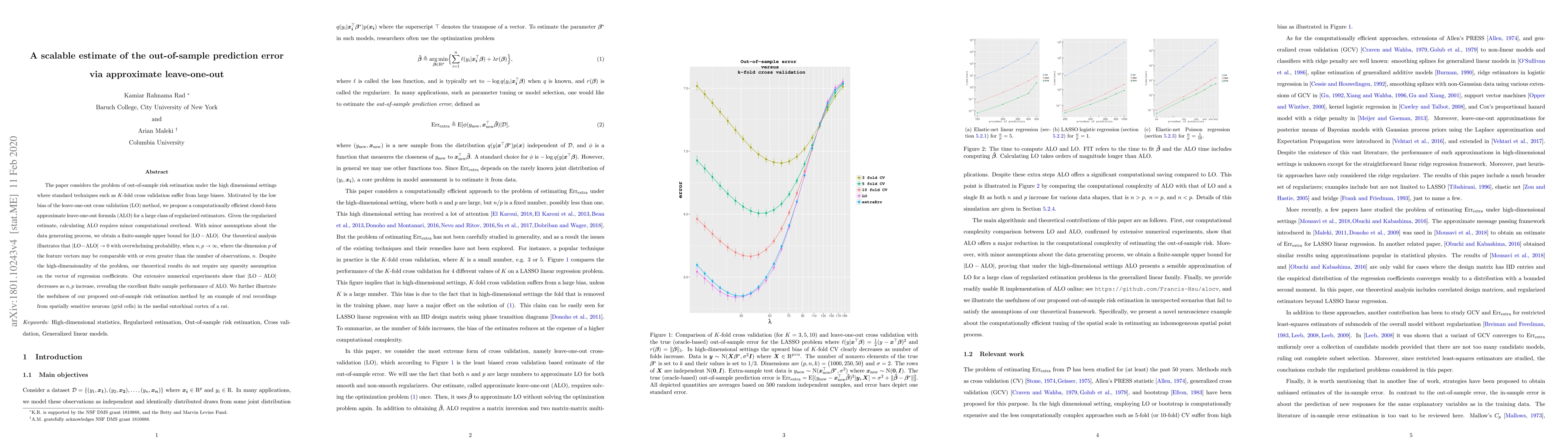 The paper considers the problem of out-of-sample risk estimation under the high dimensional settings where standard techniques such as $K$-fold cross validation suffer from large biases. Motivated by the low bias of the leave-one-out cross validation (LO) method, we propose a computationally efficient closed-form approximate leave-one-out formula (ALO) for a large class of regularized estimators. Given the regularized estimate, calculating ALO requires minor computational overhead. With minor assumptions about the data generating process, we obtain a finite-sample upper bound for $|\text{LO} - \text{ALO}|$. Our theoretical analysis illustrates that $|\text{LO} - \text{ALO}| \rightarrow 0$ with overwhelming probability, when $n,p \rightarrow \infty$, where the dimension $p$ of the feature vectors may be comparable with or even greater than the number of observations, $n$. Despite the high-dimensionality of the problem, our theoretical results do not require any sparsity assumption on the vector of regression coefficients. Our extensive numerical experiments show that $|\text{LO} - \text{ALO}|$ decreases as $n,p$ increase, revealing the excellent finite sample performance of ALO. We further illustrate the usefulness of our proposed out-of-sample risk estimation method by an example of real recordings from spatially sensitive neurons (grid cells) in the medial entorhinal cortex of a rat.