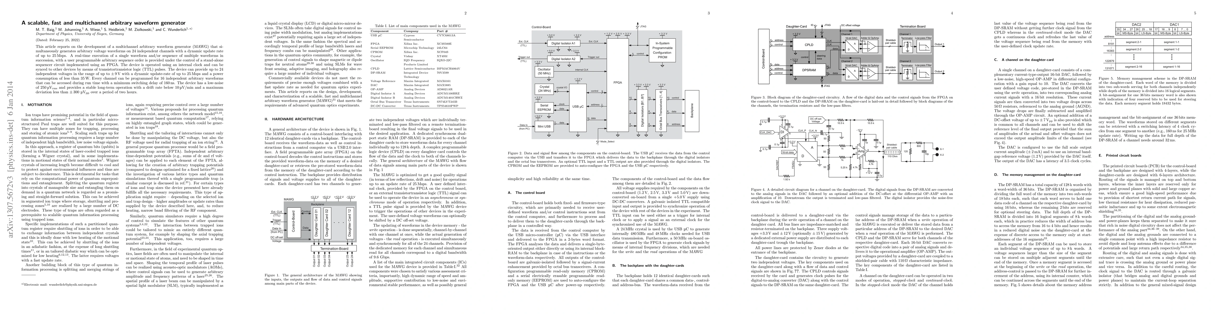 This paper presents a scalable multichannel arbitrary waveform generator (MAWG) capable of generating 24 independent voltage waveforms at up to 25 Msps, controlled by a programmable FPGA sequencer. The device features high precision with drift and deviation specifications suitable for various scientific and engineering applications.