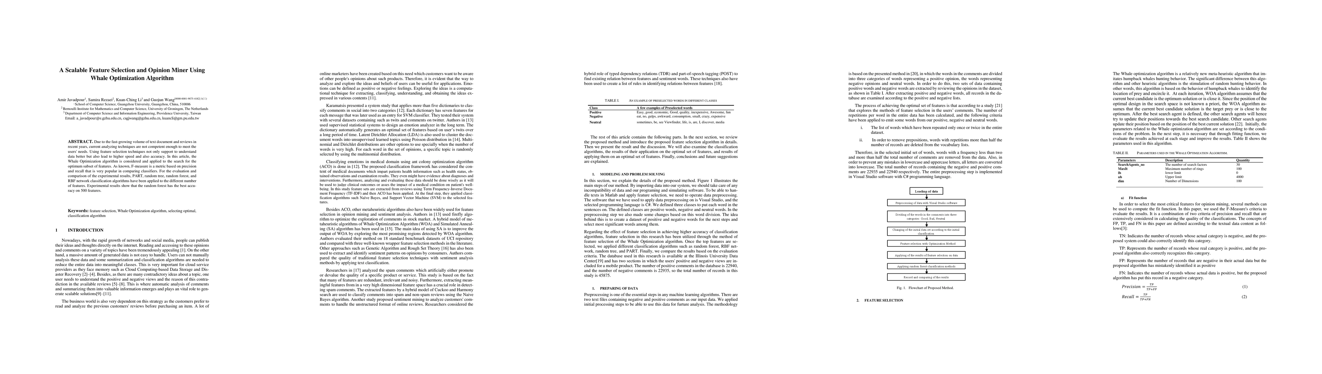This paper utilizes the Whale Optimization algorithm for scalable feature selection to enhance the understanding, speed, and accuracy of analyzing large volumes of text documents and reviews. Experimental results indicate that the random forest classification algorithm achieves the highest accuracy when using the optimal subset of 500 features selected via the Whale Optimization method.