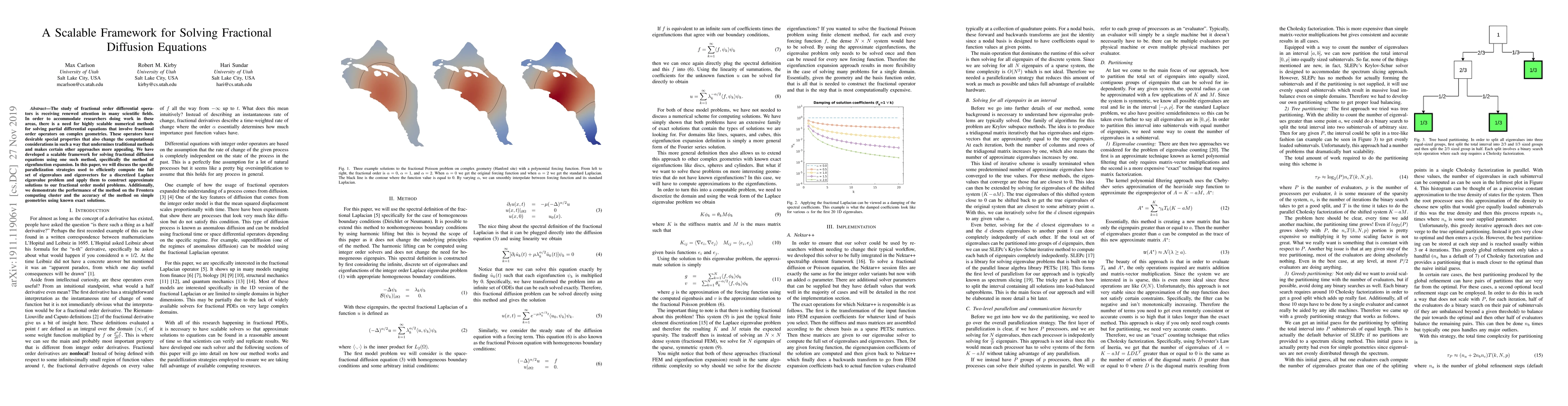 The study of fractional order differential operators is receiving renewed attention in many scientific fields. In order to accommodate researchers doing work in these areas, there is a need for highly scalable numerical methods for solving partial differential equations that involve fractional order operators on complex geometries. These operators have desirable special properties that also change the computational considerations in such a way that undermines traditional methods and makes certain other approaches more appealing. We have developed a scalable framework for solving fractional diffusion equations using one such method, specifically the method of eigenfunction expansion. In this paper, we will discuss the specific parallelization strategies used to efficiently compute the full set of eigenvalues and eigenvectors for a discretized Laplace eigenvalue problem and apply them to construct approximate solutions to our fractional order model problems. Additionally, we demonstrate the performance of the method on the Frontera computing cluster and the accuracy of the method on simple geometries using known exact solutions.