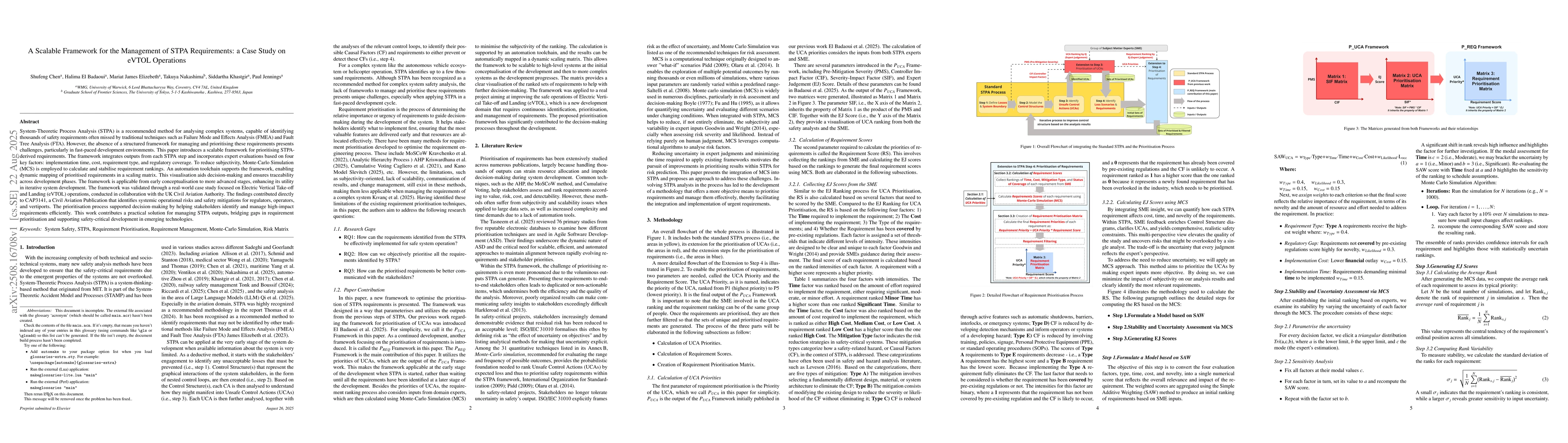 System-Theoretic Process Analysis (STPA) is a recommended method for analysing complex systems, capable of identifying thousands of safety requirements often missed by traditional techniques such as Failure Mode and Effects Analysis (FMEA) and Fault Tree Analysis (FTA). However, the absence of a structured framework for managing and prioritising these requirements presents challenges, particularly in fast-paced development environments. This paper introduces a scalable framework for prioritising STPA-derived requirements. The framework integrates outputs from each STPA step and incorporates expert evaluations based on four key factors: implementation time, cost, requirement type, and regulatory coverage. To reduce subjectivity, Monte-Carlo Simulation (MCS) is employed to calculate and stabilise requirement rankings. An automation toolchain supports the framework, enabling dynamic mapping of prioritised requirements in a scaling matrix. This visualisation aids decision-making and ensures traceability across development phases. The framework is applicable from early conceptualisation to more advanced stages, enhancing its utility in iterative system development. The framework was validated through a real-world case study focused on Electric Vertical Take-off and Landing (eVTOL) operations, conducted in collaboration with the UK Civil Aviation Authority. The findings contributed directly to CAP3141, a Civil Aviation Publication that identifies systemic operational risks and safety mitigations for regulators, operators, and vertiports. The prioritisation process supported decision-making by helping stakeholders identify and manage high-impact requirements efficiently. This work contributes a practical solution for managing STPA outputs, bridging gaps in requirement prioritisation and supporting safety-critical development in emerging technologies.