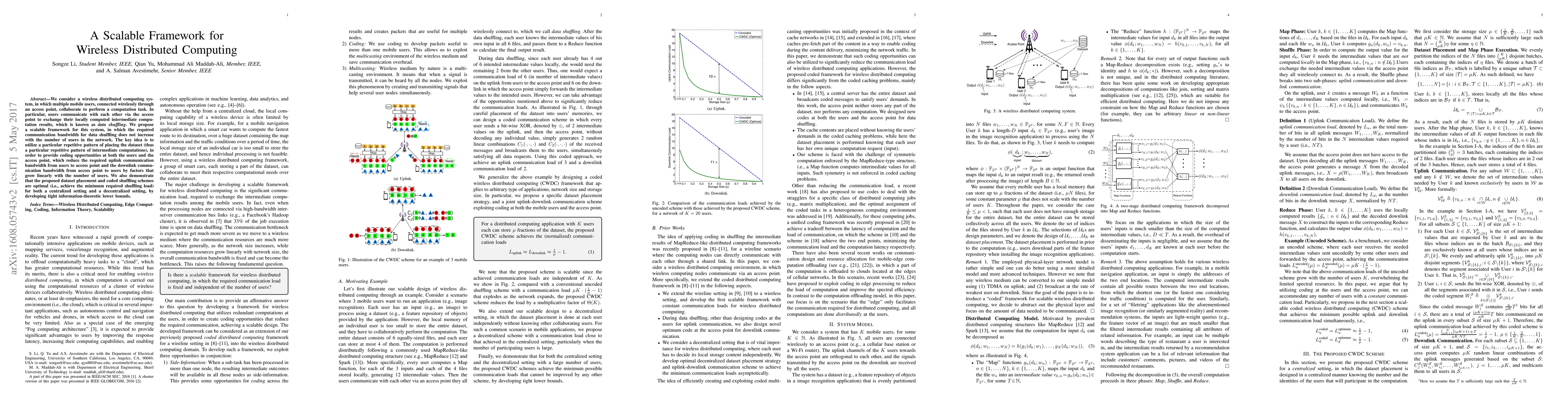 We consider a wireless distributed computing system, in which multiple mobile users, connected wirelessly through an access point, collaborate to perform a computation task. In particular, users communicate with each other via the access point to exchange their locally computed intermediate computation results, which is known as data shuffling. We propose a scalable framework for this system, in which the required communication bandwidth for data shuffling does not increase with the number of users in the network. The key idea is to utilize a particular repetitive pattern of placing the dataset (thus a particular repetitive pattern of intermediate computations), in order to provide coding opportunities at both the users and the access point, which reduce the required uplink communication bandwidth from users to access point and the downlink communication bandwidth from access point to users by factors that grow linearly with the number of users. We also demonstrate that the proposed dataset placement and coded shuffling schemes are optimal (i.e., achieve the minimum required shuffling load) for both a centralized setting and a decentralized setting, by developing tight information-theoretic lower bounds.
