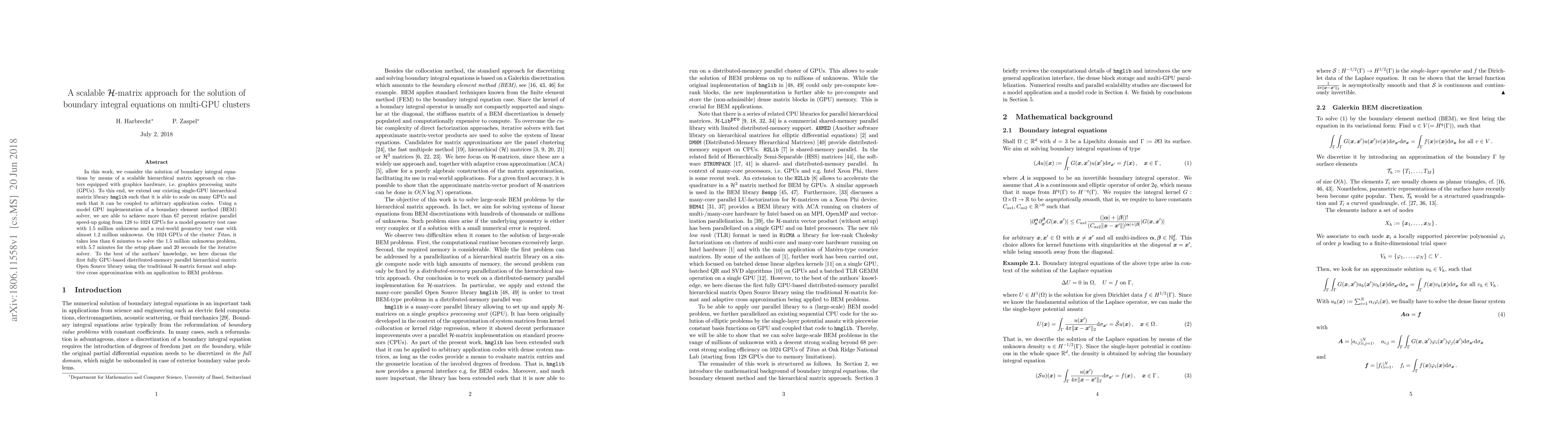 This research presents a scalable H-matrix method for solving boundary integral equations using multiple GPUs, achieving significant parallel speed-up and solving large problems in minutes. It's noted as the first open-source, GPU-based distributed-memory parallel H-matrix library for BEM problems.