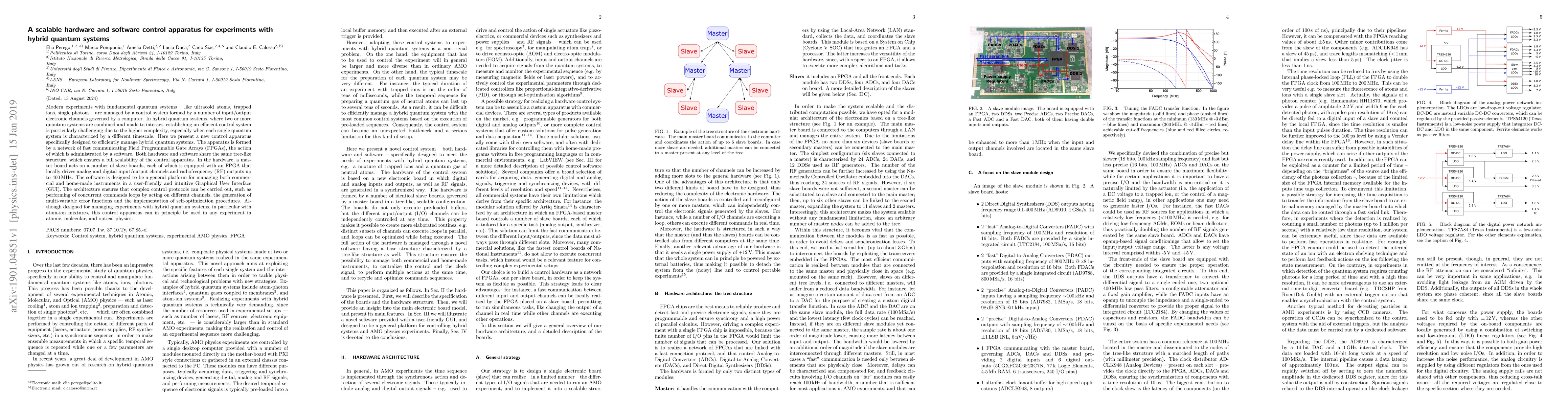 Modern experiments with fundamental quantum systems - like ultracold atoms, trapped ions, single photons - are managed by a control system formed by a number of input/output electronic channels governed by a computer. In hybrid quantum systems, where two or more quantum systems are combined and made to interact, establishing an efficient control system is particularly challenging due to the higher complexity, especially when each single quantum system is characterized by a different timescale. Here we present a new control apparatus specifically designed to efficiently manage hybrid quantum systems. The apparatus is formed by a network of fast communicating Field Programmable Gate Arrays (FPGAs), the action of which is administrated by a software. Both hardware and software share the same tree-like structure, which ensures a full scalability of the control apparatus. In the hardware, a master board acts on a number of slave boards, each of which is equipped with an FPGA that locally drives analog and digital input/output channels and radiofrequency (RF) outputs up to 400 MHz. The software is designed to be a general platform for managing both commercial and home-made instruments in a user-friendly and intuitive Graphical User Interface (GUI). The architecture ensures that complex control protocols can be carried out, such as performing of concurrent commands loops by acting on different channels, the generation of multi-variable error functions and the implementation of self-optimization procedures. Although designed for managing experiments with hybrid quantum systems, in particular with atom-ion mixtures, this control apparatus can in principle be used in any experiment in atomic, molecular, and optical physics.